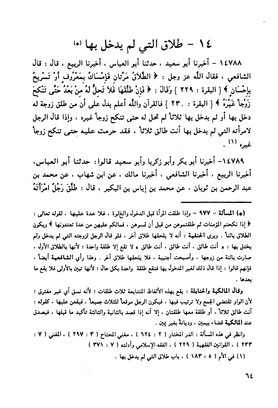 14788 - أَخْبَرَنَا أَبُو سَعِيدٍ، حَدَّثَنَا أَبُو الْعَبَّاسِ، أَخْبَرَنَا الرَّبِيعُ قَالَ: قَالَ الشَّافِعِيُّ: فَقَالَ اللَّهُ عَزَّ وَجَلَّ: {§الطَّلَاقُ مَرَّتَانِ فَإِمْسَاكٌ بِمَعْرُوفٍ أَوْ تَسْرِيحٌ بِإِحْسَانٍ} [البقرة: 229]، وَقَالَ: {فَإِنْ طَلَّقَهَا فَلَا تَحِلُّ لَهُ مِنْ بَعْدُ حَتَّى تَنْكِحَ زَوْجًا غَيْرَهُ} [البقرة: 230]، فَالْقُرْآنُ وَاللَّهُ أَعْلَمُ يَدُلُّ عَلَى أَنَّ مَنْ طَلَّقَ زَوْجَةً لَهُ دَخَلَ بِهَا أَوْ لَمْ يَدْخُلْ بِهَا ثَلَاثًا لَمْ تَحِلَّ لَهُ حَتَّى تَنْكِحَ زَوْجًا غَيْرَهُ، وَإِذَا قَالَ الرَّجُلُ لِامْرَأَتِهِ الَّتِي لَمْ يَدْخُلْ بِهَا: أَنْتِ طَالِقٌ ثَلَاثًا، فَقَدْ حُرِّمَتْ عَلَيْهِ حَتَّى تَنْكِحَ زَوْجًا غَيْرَهُ "