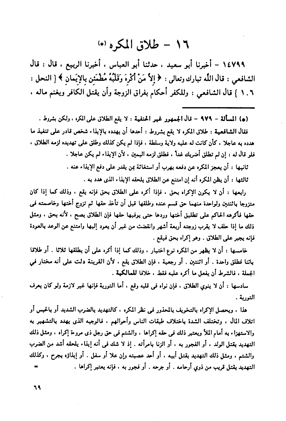 14799 - أَخْبَرَنَا أَبُو سَعِيدٍ، حَدَّثَنَا أَبُو الْعَبَّاسِ، أَخْبَرَنَا الرَّبِيعُ قَالَ: قَالَ الشَّافِعِيُّ: قَالَ اللَّهُ تَبَارَكَ وَتَعَالَى: {§إِلَّا مَنْ أُكْرِهَ وَقَلْبُهُ مُطْمَئِنٌّ بِالْإِيمَانِ} [النحل: 106]. قَالَ الشَّافِعِيُّ: " وَلِلْكُفْرِ أَحْكَامٌ بِفِرَاقِ الزَّوْجَةِ وَأَنْ يُقْتَلَ الْكَافِرُ وَيُغْنَمَ مَالُهُ -[70]-، فَلَمَّا وَضَعَ اللَّهُ تَعَالَى عَنْهُ سَقَطَتْ أَحْكَامُ الْإِكْرَاهِ عَنِ الْقَوْلِ كُلِّهِ؛ لِأَنَّ الْأَعْظَمَ إِذَا سَقَطَ عَنِ النَّاسِ سَقَطَ مَا هُوَ أَصْغَرُ مِنْهُ، وَبَسَطَ الْكَلَامَ فِي بَيَانِ الْإِكْرَاهِ ثُمَّ قَالَ -[71]-: وَإِذَا خَافَ هَذَا سَقَطَ عَنْهُ حُكْمُ مَا أُكْرِهَ عَلَيْهِ مِنْ قَوْلٍ مَا كَانَ الْقَوْلُ فَذَكَرَ الْبَيْعَ وَالنِّكَاحَ وَالطَّلَاقَ وَالْعِتَاقَ وَالْإِقْرَارَ، وَبَسَطَ الْكَلَامَ فِي شَرَحِ هَذِهِ الْجُمْلَةِ "