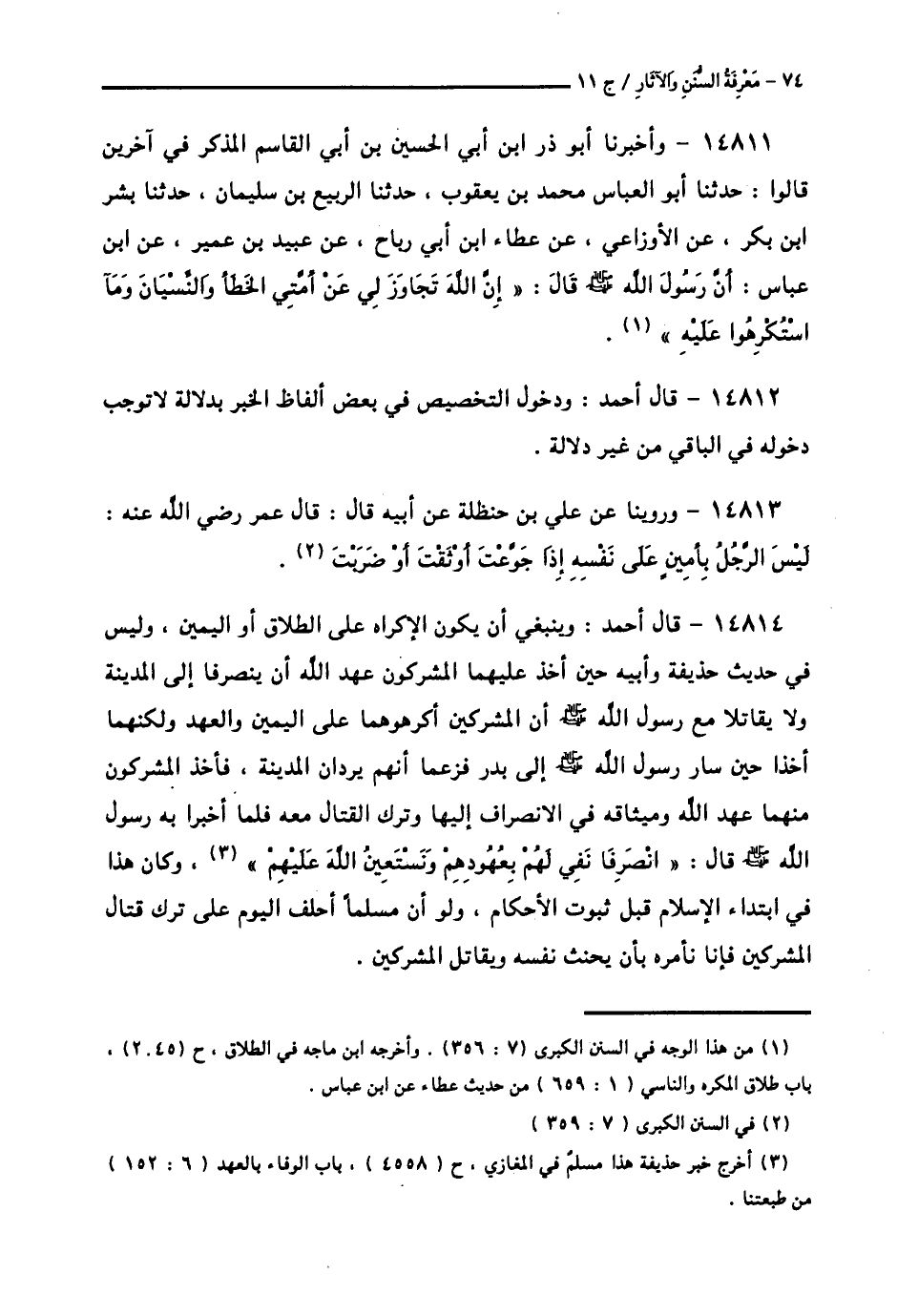 14811 - وَأَخْبَرَنَا أَبُو ذَرِّ بْنُ أَبِي الْحُسَيْنِ بْنِ أَبِي الْقَاسِمِ الْمُذَكِّرِ فِي آخَرَيْنِ قَالُوا: حَدَّثَنَا أَبُو الْعَبَّاسِ مُحَمَّدُ بْنُ يَعْقُوبَ، حَدَّثَنَا الرَّبِيعُ بْنُ سُلَيْمَانَ، حَدَّثَنَا بِشْرُ بْنُ بَكْرٍ، عَنِ الْأَوْزَاعِيِّ، عَنْ عَطَاءِ بْنِ أَبِي رَبَاحٍ، عَنْ عُبَيْدِ بْنِ عُمَيْرٍ، عَنِ ابْنِ عَبَّاسٍ أَنَّ رَسُولَ اللَّهِ صَلَّى اللهُ عَلَيْهِ وَسَلَّمَ قَالَ: «إِنَّ §اللَّهَ تَجَاوَزَ لِي عَنْ أُمَّتِي الْخَطَأَ وَالنِّسْيَانَ وَمَا اسْتُكْرِهُوا عَلَيْهِ».
