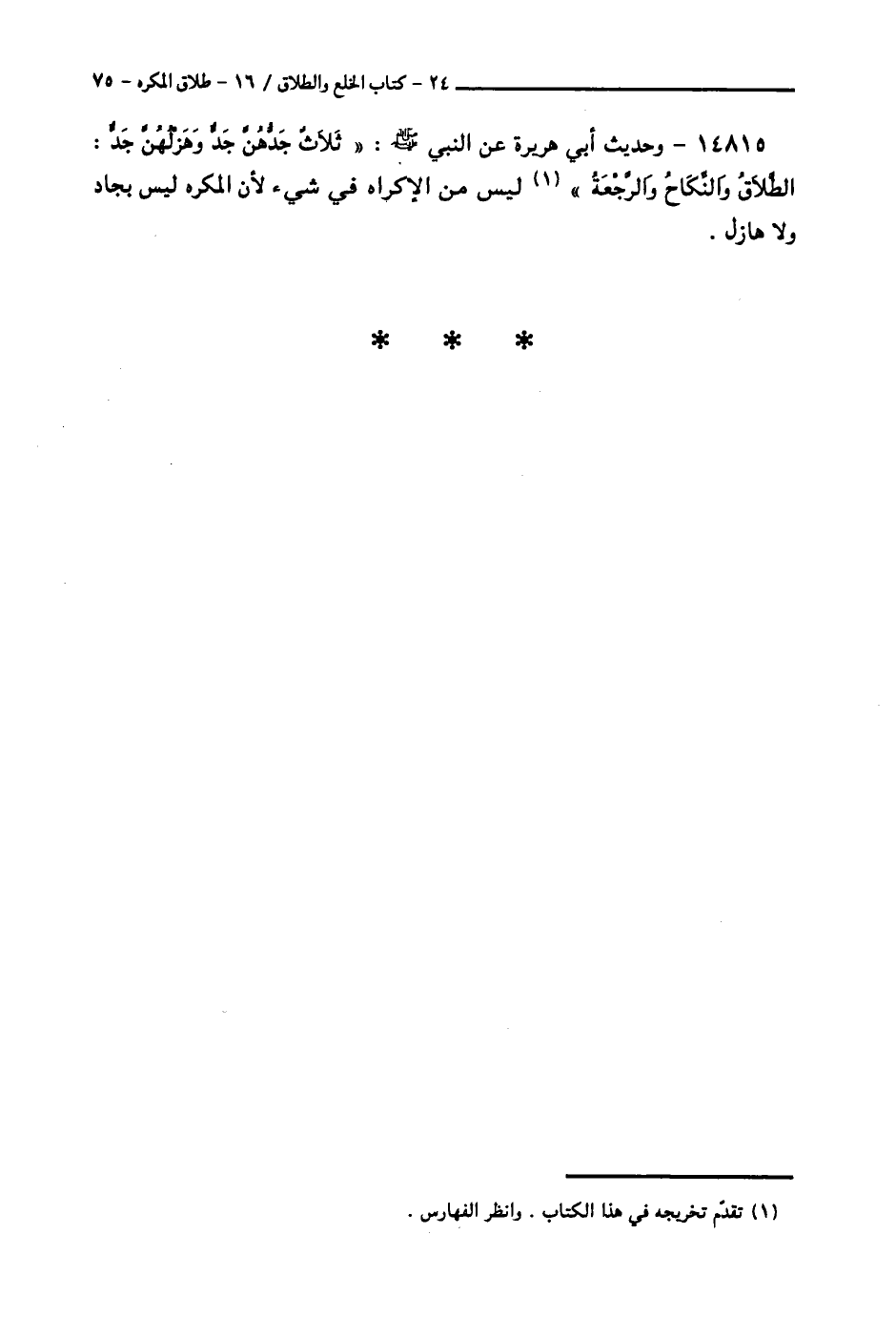 14815 - وَحَدِيثُ أَبِي هُرَيْرَةَ، عَنِ النَّبِيِّ صَلَّى اللهُ عَلَيْهِ وَسَلَّمَ: " §ثَلَاثٌ جَدُّهُنَّ جَدٌّ وَهَزْلُهُنَّ جَدٌّ: الطَّلَاقُ وَالنِّكَاحُ وَالرَّجْعَةُ " لَيْسَ مِنَ الْإِكْرَاهِ فِي شَيْءٍ لِأَنَّ الْمُكْرَهَ لَيْسَ بِجَادٍّ وَلَا هَازِلٍ