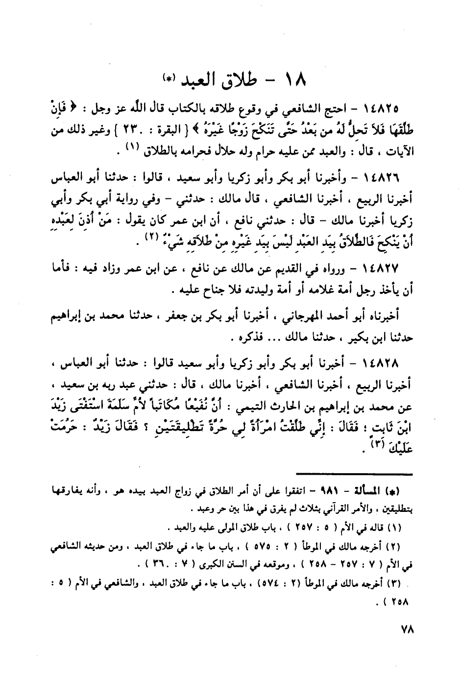 14826 - وَأَخْبَرَنَا أَبُو بَكْرٍ، وَأَبُو زَكَرِيَّا، وَأَبُو سَعِيدٍ، قَالُوا: حَدَّثَنَا أَبُو الْعَبَّاسِ، أَخْبَرَنَا الرَّبِيعُ، أَخْبَرَنَا الشَّافِعِيُّ قَالَ مَالِكٌ: حَدَّثَنِي، وَفِي رِوَايَةِ أَبِي بَكْرٍ، وَأَبِي زَكَرِيَّا، أَخْبَرَنَا مَالِكٌ قَالَ: حَدَّثَنِي نَافِعٌ، أَنَّ ابْنَ عُمَرَ، كَانَ يَقُولُ: § «مَنْ أَذِنَ لِعَبْدِهِ أَنْ يَنْكِحَ فَالطَّلَاقُ بِيَدِ الْعَبْدِ لَيْسَ بِيَدِ غَيْرِهِ مِنْ طَلَاقِهِ شَيْءٌ».