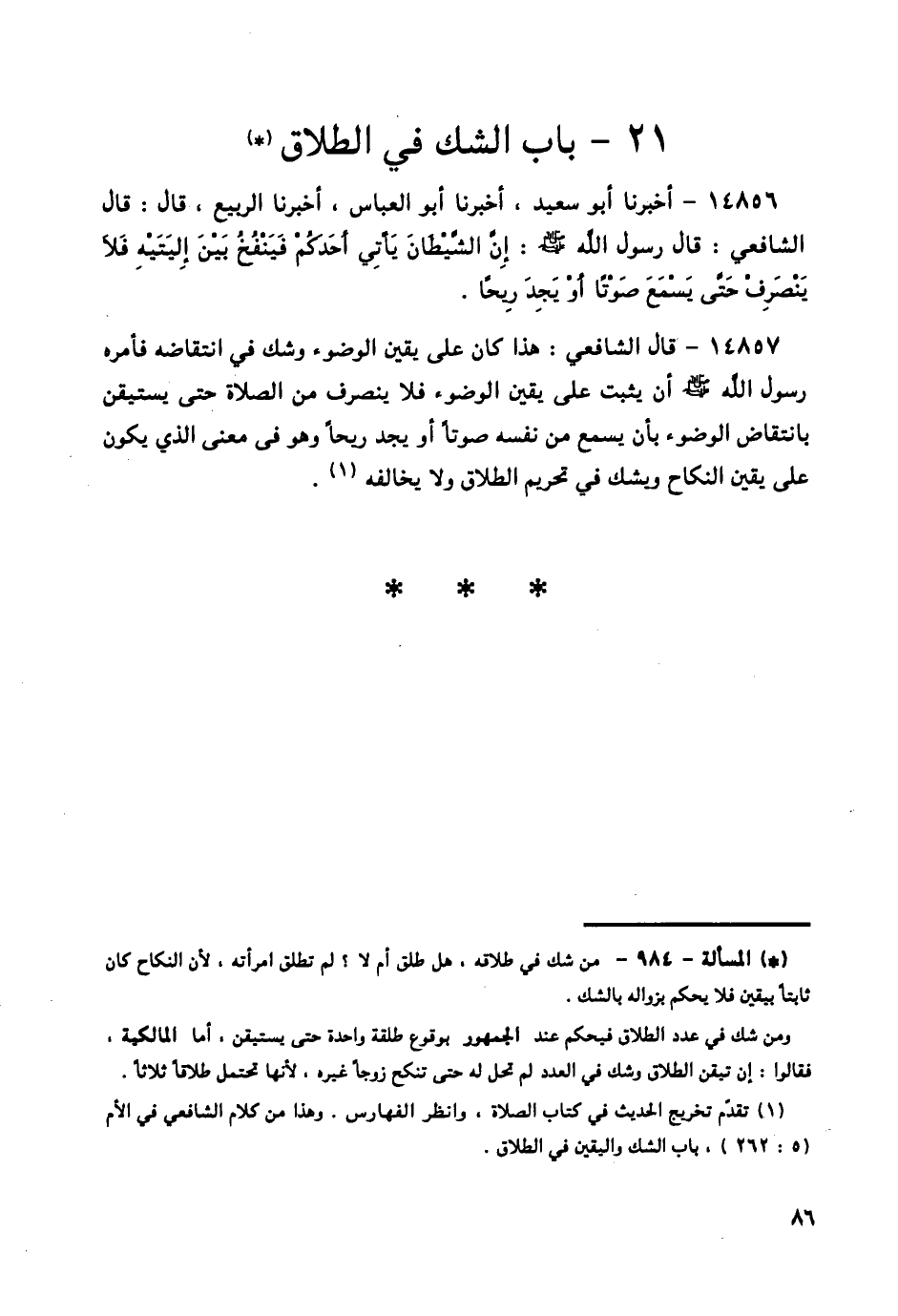 14857 - قَالَ الشَّافِعِيُّ: هَذَا كَانَ عَلَى يَقِينِ الْوُضُوءِ وَشَكَّ فِي انْتِقَاضِهِ، فَأَمَرَهُ رَسُولُ اللَّهِ صَلَّى اللهُ عَلَيْهِ وَسَلَّمَ أَنْ يَثْبُتَ عَلَى يَقِينِ الْوُضُوءِ فَلَا يَنْصَرِفَ مِنَ الصَّلَاةِ حَتَّى يَسْتَيْقِنَ بِانْتِقَاضِ الْوُضُوءِ بِأَنْ يَسْمَعَ مِنْ نَفْسِهِ صَوْتًا أَوْ يَجِدَ رِيحًا، وَهُوَ فِي مَعْنَى الَّذِي يَكُونُ عَلَى يَقِينِ النِّكَاحِ، وَيَشُكُّ فِي تَحْرِيمِ الطَّلَاقِ وَلَا يُخَالِفُهُ