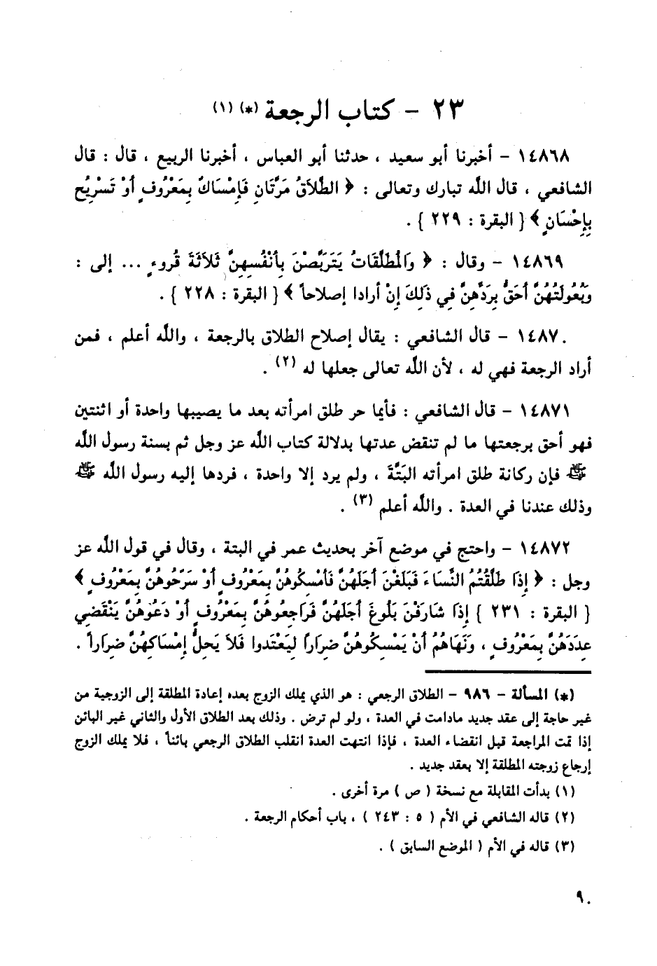 14868 - أَخْبَرَنَا أَبُو سَعِيدٍ، حَدَّثَنَا أَبُو الْعَبَّاسِ، أَخْبَرَنَا الرَّبِيعُ قَالَ: قَالَ الشَّافِعِيُّ: قَالَ اللَّهُ تَبَارَكَ وَتَعَالَى: {§الطَّلَاقُ مَرَّتَانِ فَإِمْسَاكٌ بِمَعْرُوفٍ أَوْ تَسْرِيحٌ بِإِحْسَانٍ} [البقرة: 229].