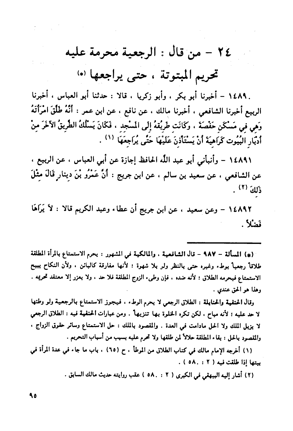 §مَنْ قَالَ: الرَّجْعِيَّةُ مُحَرَّمَةٌ عَلَيْهِ تَحْرِيمُ الْمَبْتُوتَةِ حَتَّى يُرَاجِعَهَا