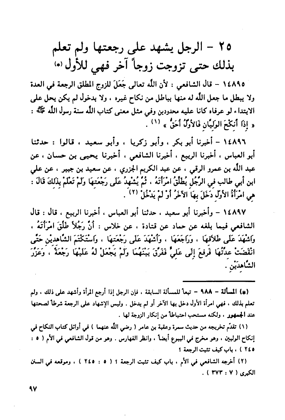 14897 - وَأَخْبَرَنَا أَبُو سَعِيدٍ، حَدَّثَنَا أَبُو الْعَبَّاسِ، أَخْبَرَنَا الرَّبِيعُ قَالَ: قَالَ الشَّافِعِيُّ فِيمَا بَلَغَهُ، عَنْ حَمَّادٍ، عَنْ قَتَادَةَ، عَنْ خِلَاسٍ، «أَنَّ §رَجُلًا طَلَّقَ امْرَأَتَهُ وَأَشْهَدَ عَلَى طَلَاقِهَا، وَرَاجَعَهَا وَأَشْهَدَ عَلَى رَجْعَتِهَا، وَاسْتَكْتَمَ الشَّاهِدَيْنِ حَتَّى انْقَضَتْ عِدَّتُهَا، فَرُفِعَ إِلَى عَلِيٍّ فَفَرَّقَ بَيْنَهُمَا وَلَمْ يَجْعَلْ لَهُ عَلَيْهَا رَجْعَةً، وَعَزَّرَ الشَّاهِدَيْنِ» -[98]-.