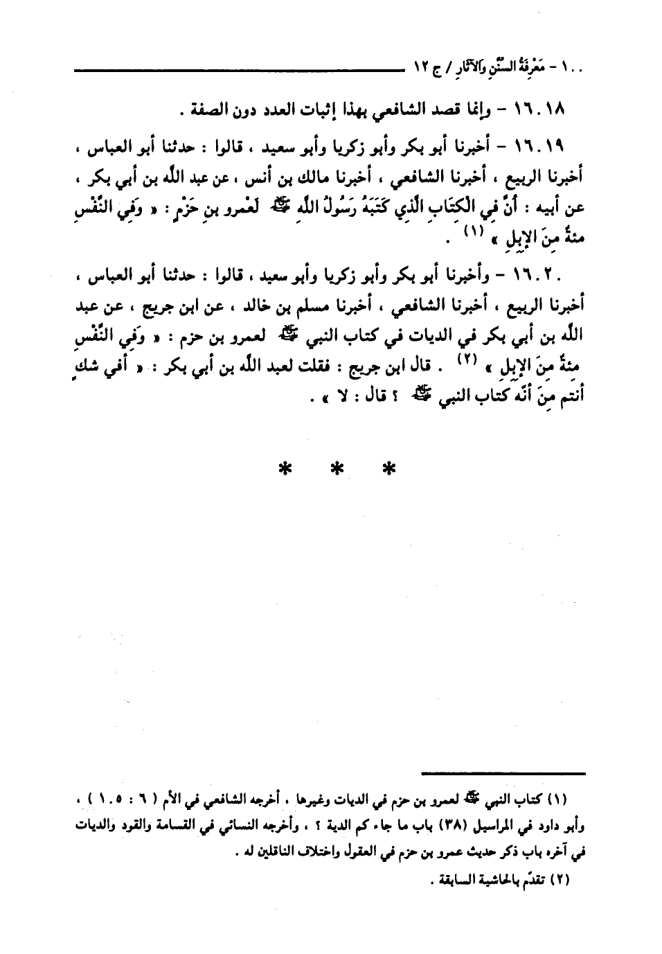 16019 - أَخْبَرَنَا أَبُو بَكْرٍ , وَأَبُو زَكَرِيَّا , وَأَبُو سَعِيدٍ , قَالُوا: حَدَّثَنَا أَبُو الْعَبَّاسِ , أَخْبَرَنَا الرَّبِيعُ , أَخْبَرَنَا الشَّافِعِيُّ , أَخْبَرَنَا مَالِكُ بْنُ أَنَسٍ , عَنْ عَبْدِ اللَّهِ بْنِ أَبِي بَكْرٍ , عَنْ أَبِيهِ أَنَّ " فِيَ الْكِتَابِ الَّذِي كَتَبَهُ رَسُولُ اللَّهِ صَلَّى اللهُ عَلَيْهِ وَسَلَّمَ لِعَمْرِو بْنِ حَزْمٍ: § «وَفِي النَّفْسِ مِائَةٌ مِنَ الْإِبِلِ»