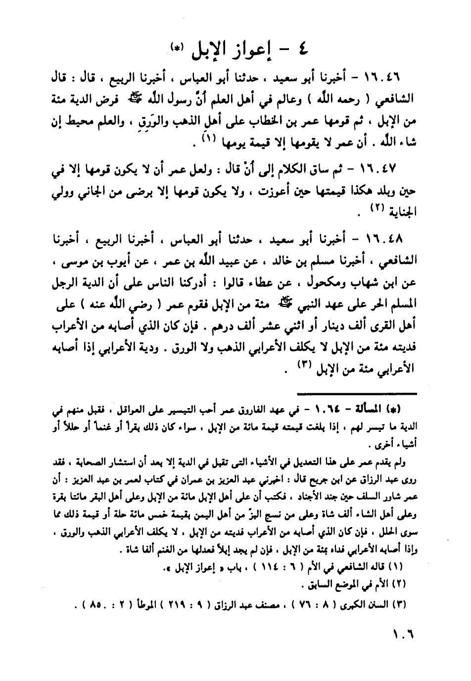 16046 - أَخْبَرَنَا أَبُو سَعِيدٍ , حَدَّثَنَا أَبُو الْعَبَّاسِ , أَخْبَرَنَا الرَّبِيعُ , قَالَ: قَالَ الشَّافِعِيُّ رَحِمَهُ اللَّهُ وَعَالِمٌ فِي أَهْلِ الْعِلْمِ , أَنَّ رَسُولَ اللَّهِ صَلَّى اللهُ عَلَيْهِ وَسَلَّمَ «فَرَضَ الدِّيَةَ مِائَةً مِنَ الْإِبِلِ , ثُمَّ قَوَمَّهَا عُمَرُ بْنُ الْخَطَّابِ عَلَى أَهْلِ الذَّهَبِ وَالْوَرِقِ , وَالْعِلْمُ مُحِيطٌ إِنْ شَاءَ اللَّهُ , أَنَّ عُمَرَ لَا يُقَوِّمُهَا إِلَّا قِيمَةَ يَوْمِهَا» ,
