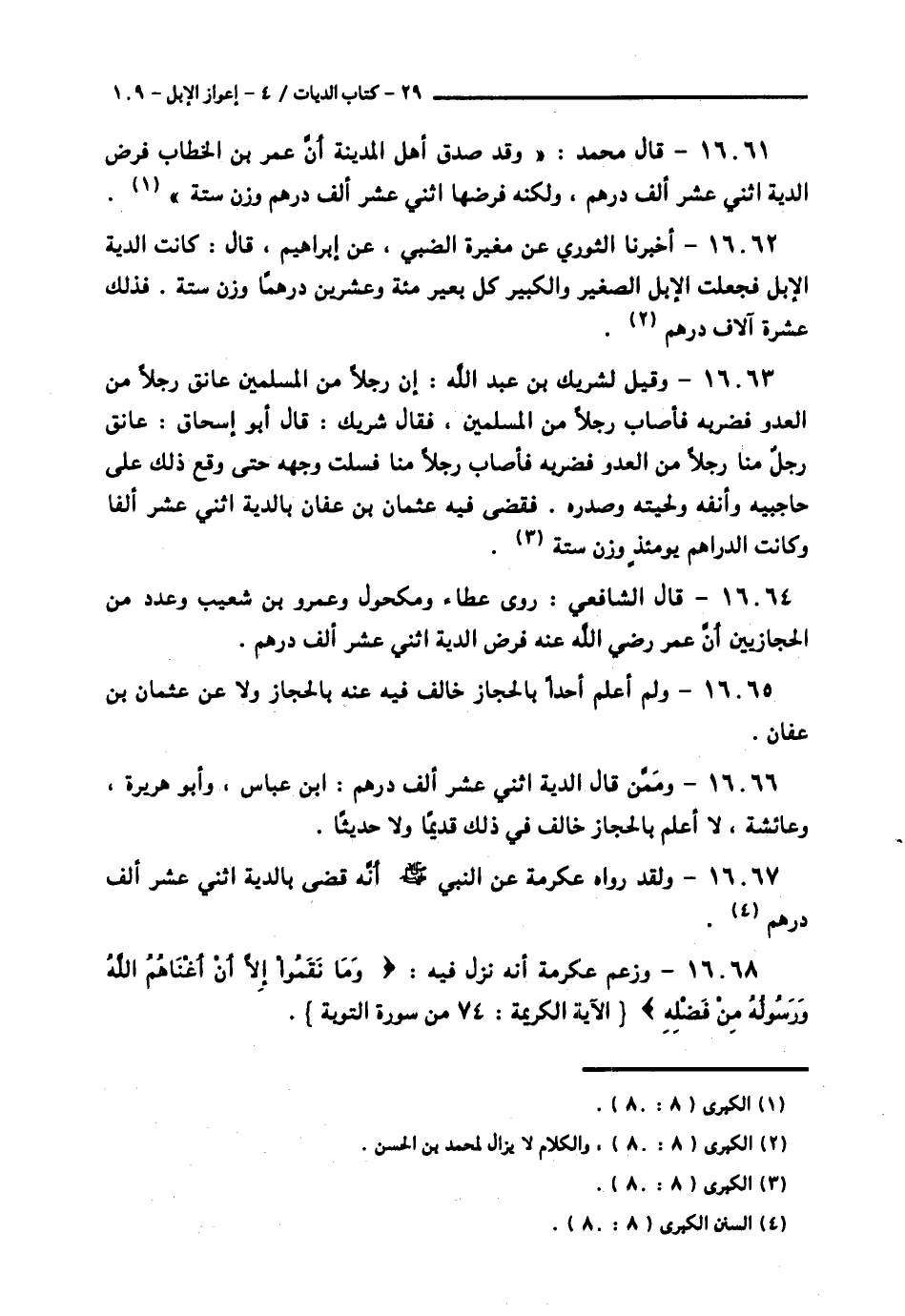 16064 - قَالَ الشَّافِعِيُّ: رَوَى عَطَاءٌ , وَمَكْحُولٌ , وَعَمْرُو بْنُ شُعَيْبٍ , وَعَدَدٌ مِنَ الْحِجَازِيِّينَ , «أَنَّ عُمَرَ رَضِيَ اللَّهُ عَنْهُ فَرَضَ الدِّيَةَ اثْنَيْ عَشَرَ أَلْفَ دِرْهَمٍ» ,