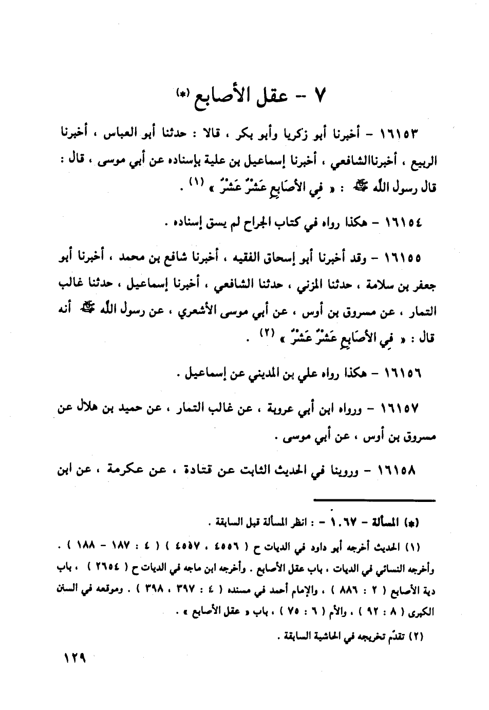 16155 - وَقَدْ أَخْبَرَنَا أَبُو إِسْحَاقَ الْفَقِيهُ , أَخْبَرَنَا شَافِعُ بْنُ مُحَمَّدٍ , أَخْبَرَنَا أَبُو جَعْفَرِ بْنُ سَلَامَةَ , حَدَّثَنَا الْمُزَنِيُّ , حَدَّثَنَا الشَّافِعِيُّ , أَخْبَرَنَا إِسْمَاعِيلُ , حَدَّثَنَا غَالِبٌ التَّمَّارُ , عَنْ مَسْرُوقِ بْنِ أَوْسٍ , عَنْ أَبِي مُوسَى الْأَشْعَرِيِّ , عَنْ رَسُولِ اللَّهِ صَلَّى اللهُ عَلَيْهِ وَسَلَّمَ أَنَّهُ قَالَ: § «فِي الْأَصَابِعِ عَشْرٌ عَشْرٌ»