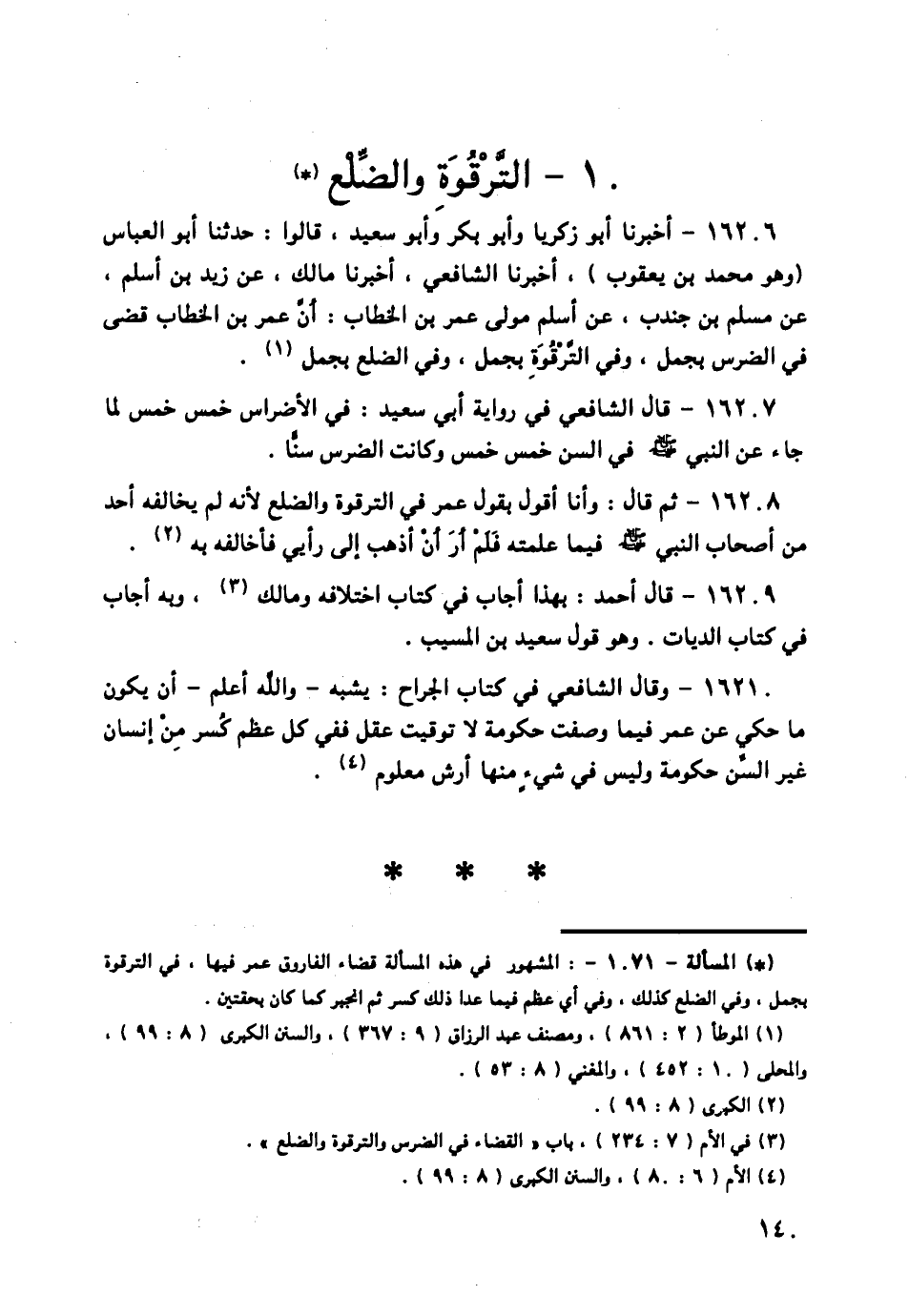 16206 - أَخْبَرَنَا أَبُو زَكَرِيَّا , وَأَبُو بَكْرٍ , وَأَبُو سَعِيدٍ , قَالُوا: حَدَّثَنَا أَبُو الْعَبَّاسِ وَهُوَ مُحَمَّدُ بْنُ يَعْقُوبَ , أَخْبَرَنَا الشَّافِعِيُّ , أَخْبَرَنَا مَالِكٌ , عَنْ زَيْدِ بْنِ أَسْلَمَ , عَنْ مُسْلِمِ بْنِ جُنْدُبٍ , عَنْ أَسْلَمَ مَوْلَى عُمَرَ بْنِ الْخَطَّابِ: §أَنَّ عُمَرَ بْنَ الْخَطَّابِ , قَضَى فِي الضِّرْسِ بِجَمَلٍ , وَفِي التَّرْقُوَةِ بِجَمَلٍ , وَفِي الضِّلَعِ بِجَمَلٍ "