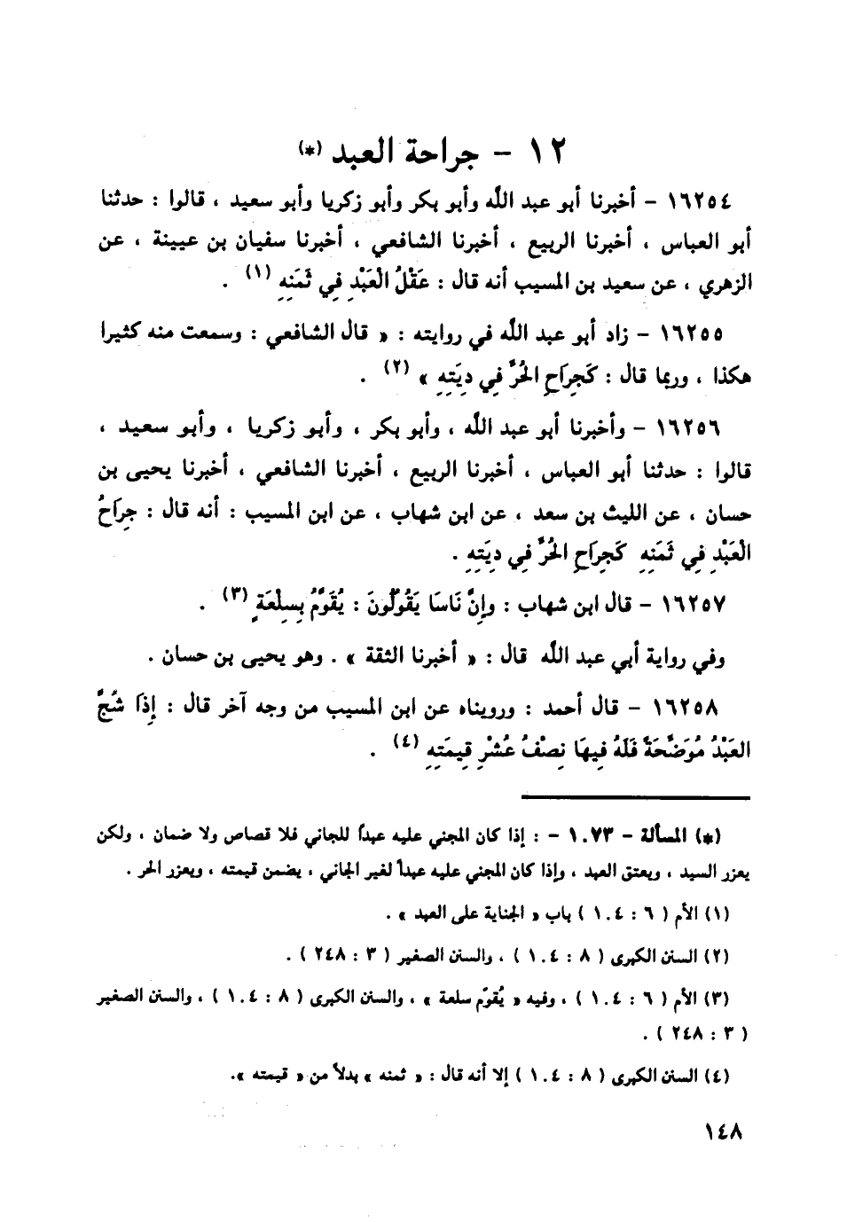 16256 - وَأَخْبَرَنَا أَبُو عَبْدِ اللَّهِ , وَأَبُو بَكْرٍ , وَأَبُو زَكَرِيَّا , وَأَبُو سَعِيدٍ , قَالُوا: حَدَّثَنَا أَبُو الْعَبَّاسِ , أَخْبَرَنَا الرَّبِيعُ , أَخْبَرَنَا الشَّافِعِيُّ , أَخْبَرَنَا يَحْيَى بْنُ حَسَّانَ , عَنِ اللَّيْثِ بْنِ سَعِيدٍ , عَنِ ابْنِ شِهَابٍ , عَنِ ابْنِ الْمُسَيِّبِ , أَنَّهُ قَالَ: § «جِرَاحُ الْعَبْدِ فِي ثَمَنِهِ كَجِرَاحِ الْحُرِّ فِي دِيَتِهِ» ,