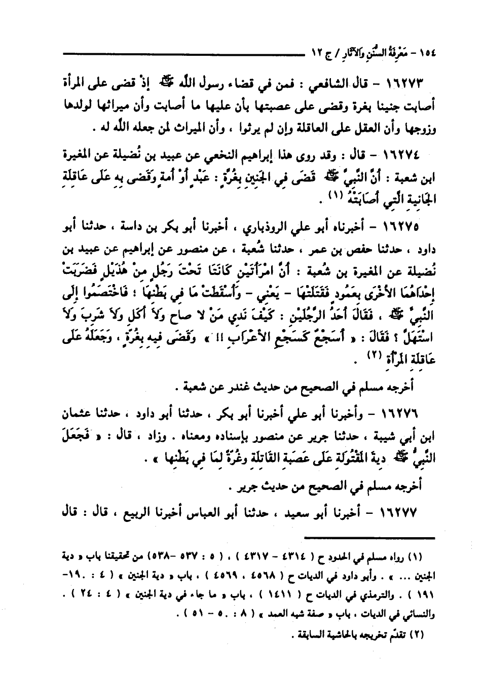 16275 - أَخْبَرَنَاهُ أَبُو عَلِيٍّ الرُّوذْبَارِيُّ , أَخْبَرَنَا أَبُو بَكْرِ بْنُ دَاسَةَ , حَدَّثَنَا أَبُو دَاوُدَ , حَدَّثَنَا حَفْصُ بْنُ عُمَرَ , حَدَّثَنَا شُعْبَةُ , عَنْ مَنْصُورٍ , عَنْ إِبْرَاهِيمَ , عَنْ عُبَيْدِ بْنِ نُضَيْلَةَ , عَنِ الْمُغِيرَةِ بْنِ شُعْبَةَ , أَنَّ §" امْرَأَتَيْنِ كَانَتَا تَحْتَ رَجُلٍ مِنْ هُذَيْلٍ , فَضَرَبَتْ إِحْدَاهُمَا الْأُخْرَى بِعَمُودٍ , فَقَتَلَتْهَا يَعْنِي وَأَسْقَطَتْ مَا فِي بَطْنِهَا , فَاخْتَصَمُوا إِلَى النَّبِيِّ صَلَّى اللهُ عَلَيْهِ وَسَلَّمَ , فَقَالَ أَحَدُ الرَّجُلَيْنِ: كَيْفَ نَدِي مَنْ لَا صَاحَ , وَلَا أَكَلَ , وَلَا شَرِبَ , وَلَا اسْتَهَلَّ؟ فَقَالَ: «أَسَجْعٌ كَسَجْعِ الْأَعْرَابِ؟» وَقَضَى فِيهِ بِغُرَّةٍ , وَجَعَلَهُ عَلَى عَاقِلَةِ الْمَرْأَةِ " أَخْرَجَهُ مُسْلِمٌ فِي الصَّحِيحِ مِنْ حَدِيثِ غُنْدَرٍ , عَنْ شُعْبَةَ