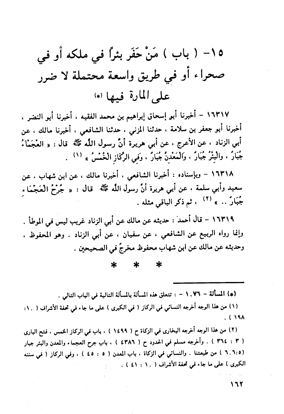 16317 - أَخْبَرَنَا أَبُو إِسْحَاقَ إِبْرَاهِيمُ بْنُ مُحَمَّدٍ الْفَقِيهُ , أَخْبَرَنَا أَبُو النَّضْرِ , أَخْبَرَنَا أَبُو جَعْفَرِ بْنُ سَلَامَةَ , حَدَّثَنَا الْمُزَنِيُّ , حَدَّثَنَا الشَّافِعِيُّ , أَخْبَرَنَا مَالِكٌ , عَنْ أَبِي الزِّنَادِ , عَنِ الْأَعْرَجِ , عَنْ أَبِي هُرَيْرَةَ , أَنَّ رَسُولَ اللَّهِ صَلَّى اللهُ عَلَيْهِ وَسَلَّمَ قَالَ: § «الْعَجْمَاءُ جُبَارٌ , وَالْبِئْرُ جُبَارٌ , وَالْمَعْدِنُ جُبَارٌ , وَفِي الرِّكَازِ الْخُمُسُ»