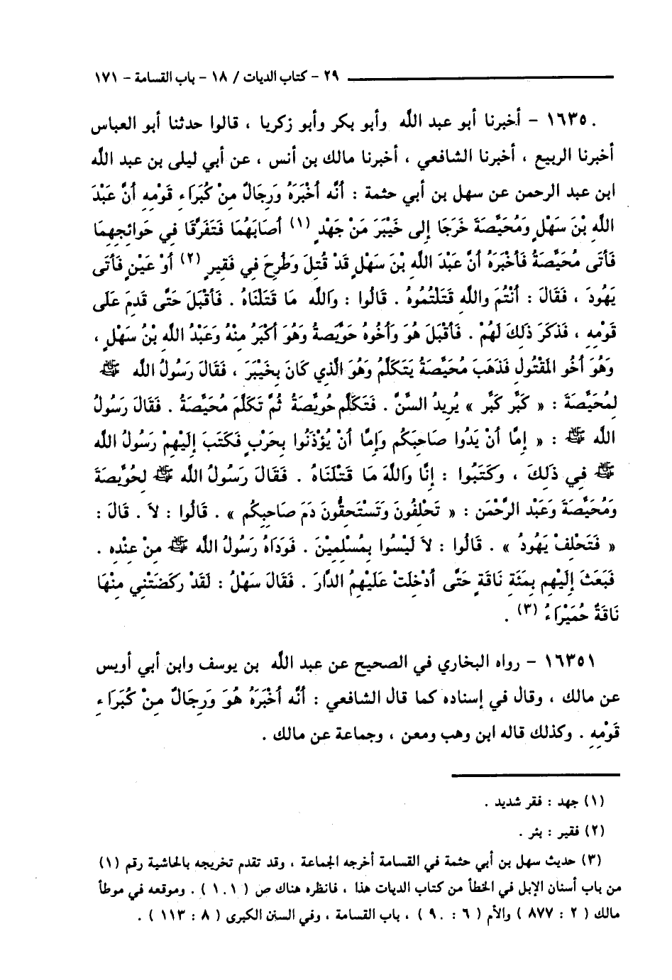 16350 - أَخْبَرَنَا أَبُو عَبْدِ اللَّهِ , وَأَبُو بَكْرٍ , وَأَبُو زَكَرِيَّا , قَالُوا حَدَّثَنَا أَبُو الْعَبَّاسِ , أَخْبَرَنَا الرَّبِيعُ , أَخْبَرَنَا الشَّافِعِيُّ , أَخْبَرَنَا مَالِكُ بْنُ أَنَسٍ , عَنْ أَبِي لَيْلَى بْنِ عَبْدِ اللَّهِ بْنِ عَبْدِ الرَّحْمَنِ , عَنْ سَهْلِ بْنِ أَبِي حَثْمَةَ: أَنَّهُ أَخْبَرَهُ وَرِجَالٌ مِنْ كُبَرَاءِ قَوْمِهِ أَنَّ عَبْدَ اللَّهِ بْنَ سَهْلٍ , وَمُحَيِّصَةَ خَرَجَا إِلَى خَيْبَرَ مِنْ جَهْدٍ أَصَابَهُمَا , فَتَفَرَّقَا فِي حَوَائِجِهِمَا , فَأَتَى مُحَيِّصَةَ فَأَخْبَرَهُ أَنَّ عَبْدَ اللَّهِ بْنَ سَهْلٍ قَدْ قُتِلَ , وَطُرِحَ فِي فَقِيرٍ أَوْ عَيْنٍ , فَأَتَى يَهُودَ , فَقَالَ: أَنْتُمْ وَاللَّهِ قَتَلْتُمُوهُ. قَالُوا: وَاللَّهِ مَا قَتَلْنَاهُ فَأَقْبَلَ حَتَّى قَدِمَ عَلَى قَوْمِهِ , فَذَكَرَ ذَلِكَ لَهُمْ , فَأَقْبَلَ هُوَ وَأَخُوهُ حُوَيِّصَةُ وَهُوَ أَكْبَرُ مِنْهُ , وَعَبْدُ اللَّهِ بْنُ سَهْلٍ , وَهُوَ أَخُو الْمَقْتُولِ فَذَهَبَ مُحَيِّصَةُ يَتَكَلَّمُ وَهُوَ الَّذِي كَانَ بِخَيْبَرَ , فَقَالَ رَسُولُ اللَّهِ صَلَّى اللهُ عَلَيْهِ وَسَلَّمَ لِمُحَيِّصَةَ: «كَبِّرْ كَبِّرْ» يُرِيدُ السِّنَّ , فَتَكَلَّمَ حُوَيِّصَةُ ثُمَّ تَكَلَّمَ مُحَيِّصَةُ , فَقَالَ رَسُولُ اللَّهِ صَلَّى اللهُ عَلَيْهِ وَسَلَّمَ: «§إِمَّا أَنْ يَدُوا صَاحِبَكُمْ , وَإِمَّا أَنْ يُؤْذِنُوا بِحَرْبٍ» , فَكَتَبَ إِلَيْهِمْ رَسُولُ اللَّهِ صَلَّى اللهُ عَلَيْهِ وَسَلَّمَ فِي ذَلِكَ , وَكَتَبُوا: إِنَّا وَاللَّهِ مَا قَتَلْنَاهُ , فَقَالَ رَسُولُ اللَّهِ صَلَّى اللهُ عَلَيْهِ وَسَلَّمَ لِحُوَيِّصَةَ , وَمُحَيِّصَةَ , وَعَبْدِ الرَّحْمَنِ: «تَحْلِفُونَ وَتَسْتَحِقُّونَ دَمَ صَاحِبِكُمْ» , قَالُوا: لَا , قَالَ: «فَتَحْلِفُ يَهُودُ» قَالُوا: لَا لَيْسُوا بِمُسْلِمِينَ , فَوَدَاهُ رَسُولُ اللَّهِ صَلَّى اللهُ عَلَيْهِ وَسَلَّمَ مِنْ عِنْدِهِ , فَبَعَثَ إِلَيْهِمْ مِائَةَ نَاقَةٍ , حَتَّى أُدْخِلَتْ عَلَيْهِمُ الدَّارَ. فَقَالَ سَهْلٌ: لَقَدْ رَكَضَتْنِي مِنْهَا نَاقَةٌ حُمَيْرَاءُ"