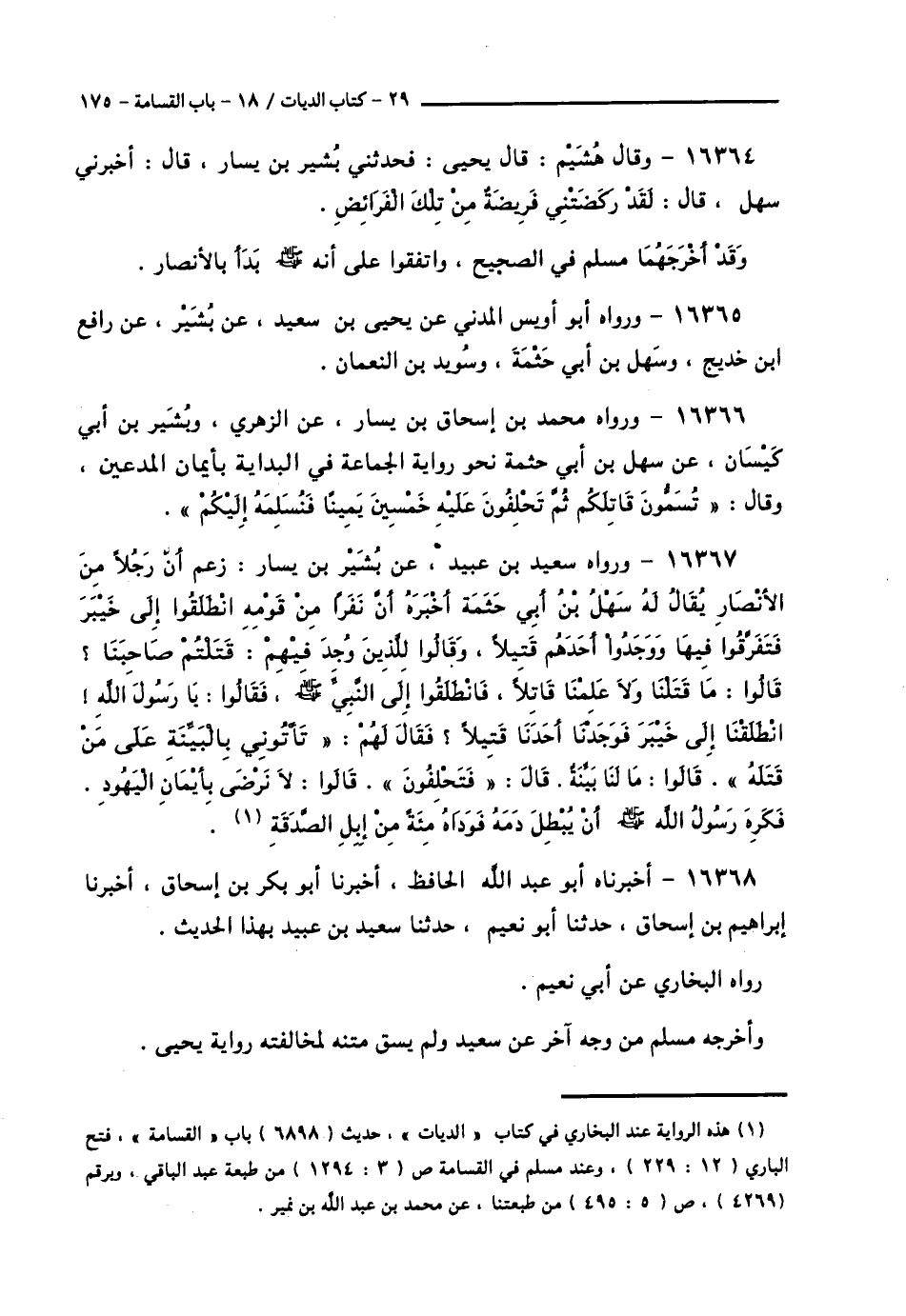 16366 - وَرَوَاهُ مُحَمَّدُ بْنُ إِسْحَاقَ بْنِ يَسَارٍ , عَنِ الزُّهْرِيِّ , وَبَشِيرُ بْنُ أَبِي كَيْسَانَ , عَنْ سَهْلِ بْنِ أَبِي حَثْمَةَ , نَحْوَ رِوَايَةِ الْجَمَاعَةِ فِي الْبِدَايَةِ بِأَيْمَانِ الْمُدَّعِينَ , وَقَالَ: «تُسَمُّونَ قَاتِلَكُمْ ثُمَّ تَحْلِفُونَ عَلَيْهِ خَمْسِينَ يَمِينًا فَنُسَلِّمُهُ إِلَيْكُمْ»