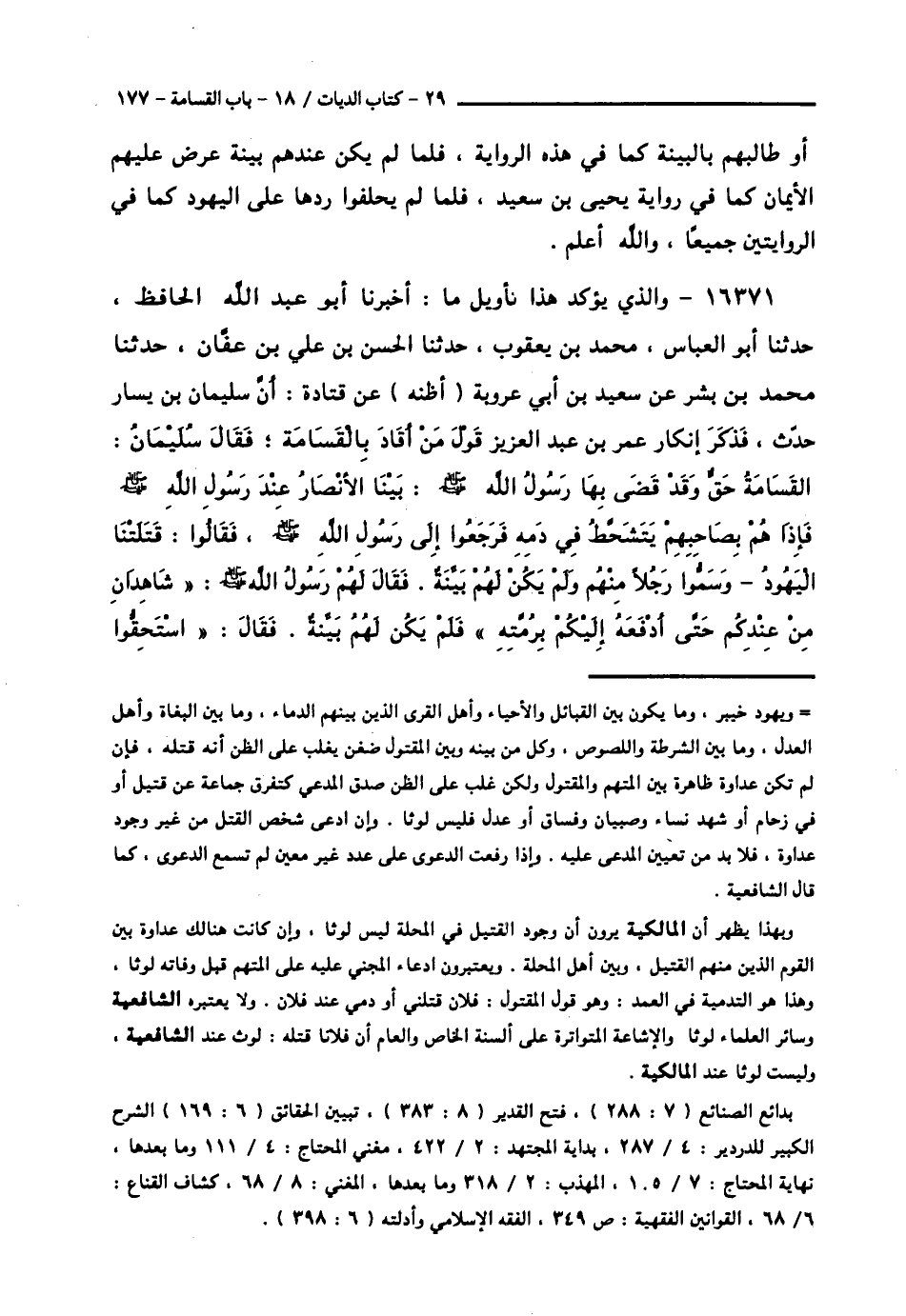 16371 - وَالَّذِي يُؤَكِّدُ هَذَا تَأْوِيلُ مَا: أَخْبَرَنَا أَبُو عَبْدِ اللَّهِ الْحَافِظُ , حَدَّثَنَا أَبُو الْعَبَّاسِ مُحَمَّدُ بْنُ يَعْقُوبَ , حَدَّثَنَا الْحَسَنُ بْنُ عَلِيِّ بْنِ عَفَّانَ , حَدَّثَنَا مُحَمَّدُ بْنُ بِشْرٍ , عَنْ سَعِيدِ بْنِ أَبِي عَرُوبَةَ , أَظُنُّهُ عَنْ قَتَادَةَ , أَنَّ سُلَيْمَانَ بْنَ يَسَارٍ , حَدَّثَ , فَذَكَرَ إِنْكَارَ عُمَرَ بْنِ عَبْدِ الْعَزِيزِ قَوْلَ مَنْ أَقَادَ بِالْقَسَامَةِ , فَقَالَ سُلَيْمَانُ: §" الْقَسَامَةُ حَقٌّ , وَقَدْ قَضَى بِهَا رَسُولُ اللَّهِ صَلَّى اللهُ عَلَيْهِ وَسَلَّمَ بَيْنَ الْأَنْصَارِ عِنْدَ رَسُولِ اللَّهِ صَلَّى اللهُ عَلَيْهِ وَسَلَّمَ , فَإِذَا هُمْ بِصَاحِبِهِمْ يَتَشَحَّطُ فِي دَمِهِ , فَرَجَعُوا إِلَى رَسُولِ اللَّهِ صَلَّى اللهُ عَلَيْهِ وَسَلَّمَ , فَقَالُوا: قَتَلَتْنَا الْيَهُودُ , وَسَمُّوا رَجُلًا مِنْهُمْ وَلَمْ يَكُنْ لَهُمْ بَيِّنَةٌ , فَقَالَ لَهُمْ رَسُولُ اللَّهِ صَلَّى اللهُ عَلَيْهِ وَسَلَّمَ: «شَاهِدَانِ مِنْ عِنْدِكُمْ حَتَّى أَدْفَعَهُ إِلَيْكُمْ بِرُمَّتِهِ» , فَلَمْ يَكُنْ لَهُمْ بَيِّنَةٌ , فَقَالَ: «اسْتَحِقُّوا -[178]- بِخَمْسِينَ قَسَامَةً أَدْفَعْهُ إِلَيْكُمْ بِرُمَّتِهِ» , فَقَالُوا: " يَا رَسُولَ اللَّهِ إِنَّا نَكْرَهُ أَنْ نَحْلِفَ عَلَى غَيْبٍ , فَأَرَادَ رَسُولُ اللَّهِ صَلَّى اللهُ عَلَيْهِ وَسَلَّمَ أَنْ يَأْخُذَ بِقَسَامَةِ الْيَهُودِ بِخَمْسِينَ مِنْهُمْ , قَالَتِ الْأَنْصَارُ: يَا رَسُولَ اللَّهِ إِنَّ الْيَهُودَ لَا يُبَالُونَ الْحَلِفَ مَهْمَا نَقْبَلُ هَذَا مِنْهُمْ يَأْتُونَ عَلَى آخِرِنَا , فَوَدَاهُ رَسُولُ اللَّهِ صَلَّى اللهُ عَلَيْهِ وَسَلَّمَ مِنْ عِنْدِهِ " ,