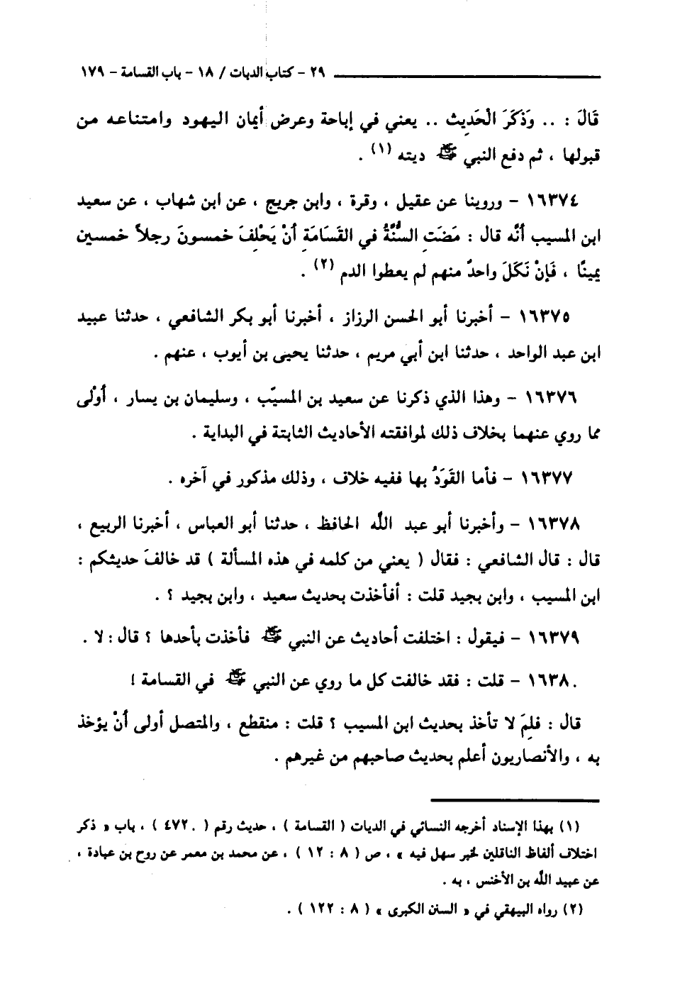 16374 - وَرُوِّينَا عَنْ عُقَيْلٍ , وَقُرَّةَ , وَابْنِ جُرَيْجٍ , عَنِ ابْنِ شِهَابٍ , عَنْ سَعِيدِ بْنِ الْمُسَيِّبِ , أَنَّهُ قَالَ: § «مَضَتِ السُّنَّةُ فِي الْقَسَامَةِ أَنْ يَحْلِفَ خَمْسُونَ رَجُلًا خَمْسِينَ يَمِينًا , فَإِنْ نَكَلَ وَاحِدٌ مِنْهُمْ لَمْ يُعْطَوَا الدَّمَ» ,