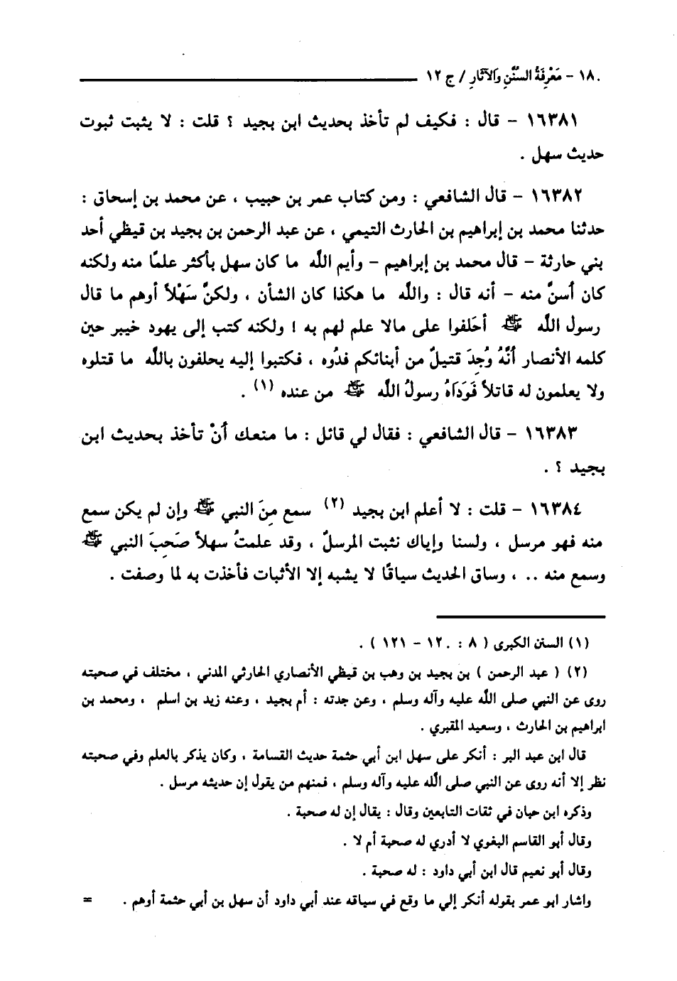 16384 - قُلْتُ: لَا أَعْلَمُ ابْنَ بُجَيْدٍ سَمِعَ مِنَ النَّبِيِّ صَلَّى اللهُ عَلَيْهِ وَسَلَّمَ , وَإِنْ لَمْ يَكُنْ سَمِعَ مِنْهُ فَهُوَ مُرْسَلٌ , وَلَسْنَا وَإِيَّاكَ نُثْبِتُ الْمُرْسَلَ , وَقَدْ عَلِمْتُ سَهْلًا صَحِبَ النَّبِيَّ صَلَّى اللهُ عَلَيْهِ وَسَلَّمَ وَسَمِعَ مِنْهُ. وَسَاقَ الْحَدِيثَ سِيَاقًا لَا يُشْبِهُ إِلَّا الْأَثْبَاتَ , فَأَخَذْتُ بِهِ لِمَا وَصَفْتُ , -[181]-