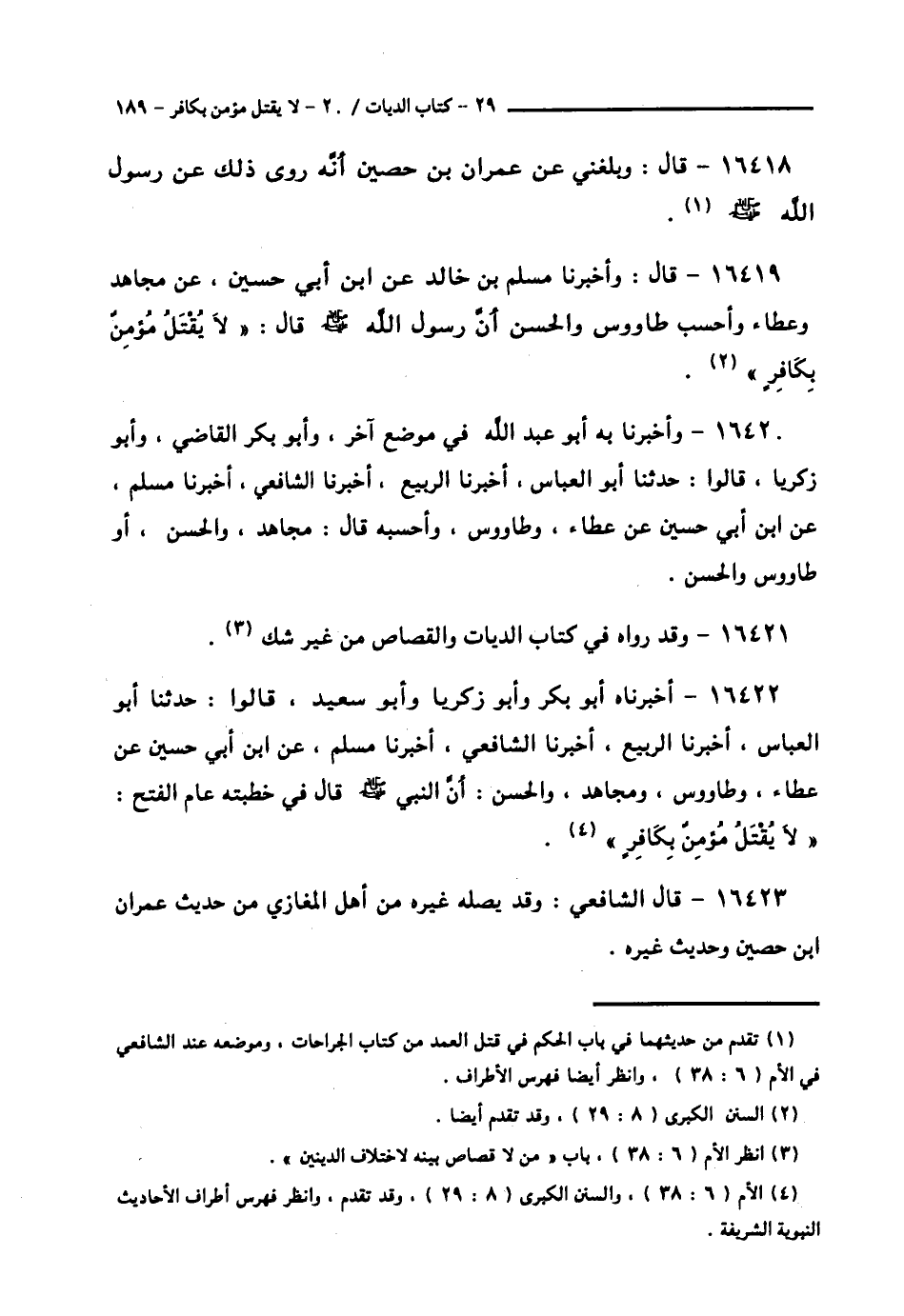 16419 - قَالَ: وَأَخْبَرَنَا مُسْلِمُ بْنُ خَالِدٍ , عَنِ ابْنِ أَبِي حُسَيْنٍ , عَنْ مُجَاهِدٍ , وَعَطَاءٍ , وَأَحْسَبُ طَاوُسًا , وَالْحَسَنَ , أَنَّ رَسُولَ اللَّهِ صَلَّى اللهُ عَلَيْهِ وَسَلَّمَ قَالَ: § «لَا يُقْتَلُ مُؤْمِنٌ بِكَافِرٍ» ,