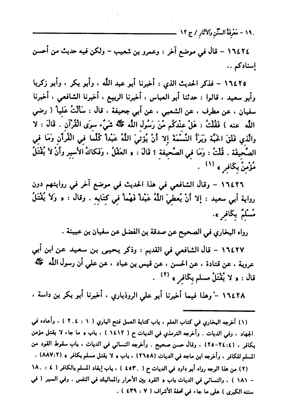 16426 - وَقَالَ الشَّافِعِيُّ فِي هَذَا الْحَدِيثِ فِي مَوْضِعٍ آخَرَ فِي رِوَايَتِهِمْ دُونَ رِوَايَةِ أَبِي سَعِيدٍ: إِلَّا أَنْ يُعْطِيَ اللَّهُ عَبْدًا فَهْمًا فِي كِتَابِهِ , وَقَالَ: «وَلَا يُقْتَلُ مُسْلِمٌ بِكَافِرٍ» رَوَاهُ الْبُخَارِيُّ فِي الصَّحِيحِ عَنْ صَدَقَةَ بْنِ الْفَضْلِ , عَنْ سُفْيَانَ بْنِ عُيَيْنَةَ