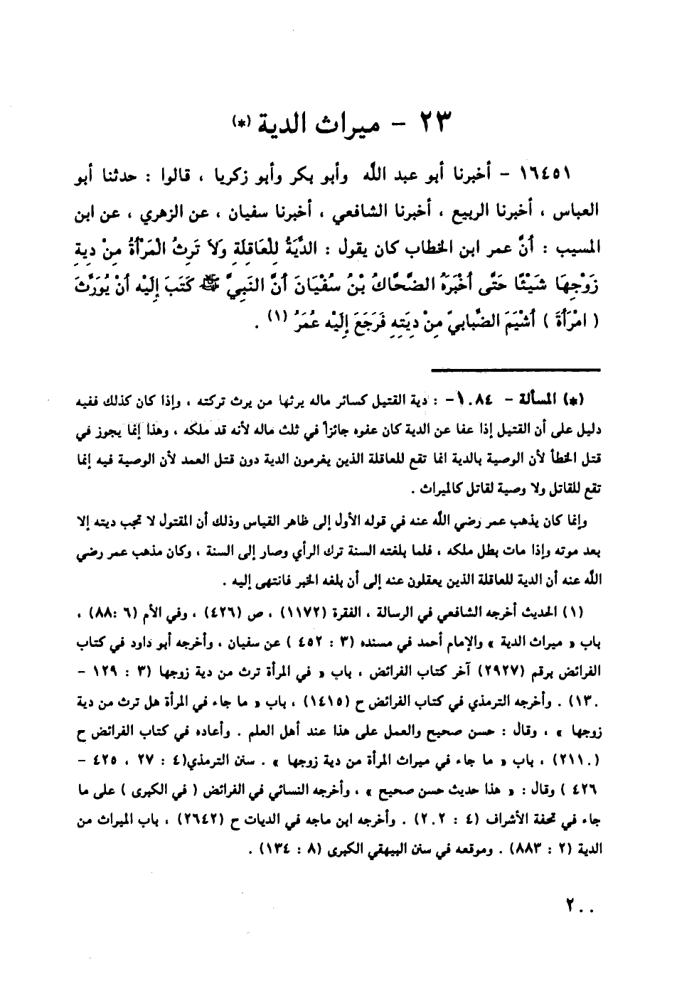 16451 - أَخْبَرَنَا أَبُو عَبْدِ اللَّهِ , وَأَبُو بَكْرٍ , وَأَبُو زَكَرِيَّا , قَالُوا: حَدَّثَنَا أَبُو الْعَبَّاسِ , أَخْبَرَنَا الرَّبِيعُ , أَخْبَرَنَا الشَّافِعِيُّ , أَخْبَرَنَا سُفْيَانُ , عَنِ الزُّهْرِيِّ , عَنِ ابْنِ الْمُسَيِّبِ: أَنَّ عُمَرَ بْنَ الْخَطَّابِ , كَانَ يَقُولُ: § «الدِّيَةُ لِلْعَاقِلَةِ , وَلَا تَرِثُ الْمَرْأَةُ مِنْ دِيَةِ زَوْجِهَا شَيْئًا حَتَّى أَخْبَرَهُ الضَّحَّاكُ بْنُ سُفْيَانَ , أَنَّ النَّبِيَّ صَلَّى اللهُ عَلَيْهِ وَسَلَّمَ كَتَبَ إِلَيْهِ أَنْ يُورِّثَ امْرَأَةَ أَشْيَمَ الضِّبَابِيِّ مِنْ دِيَتِهِ , فَرَجَعَ إِلَيْهِ عُمَرُ»