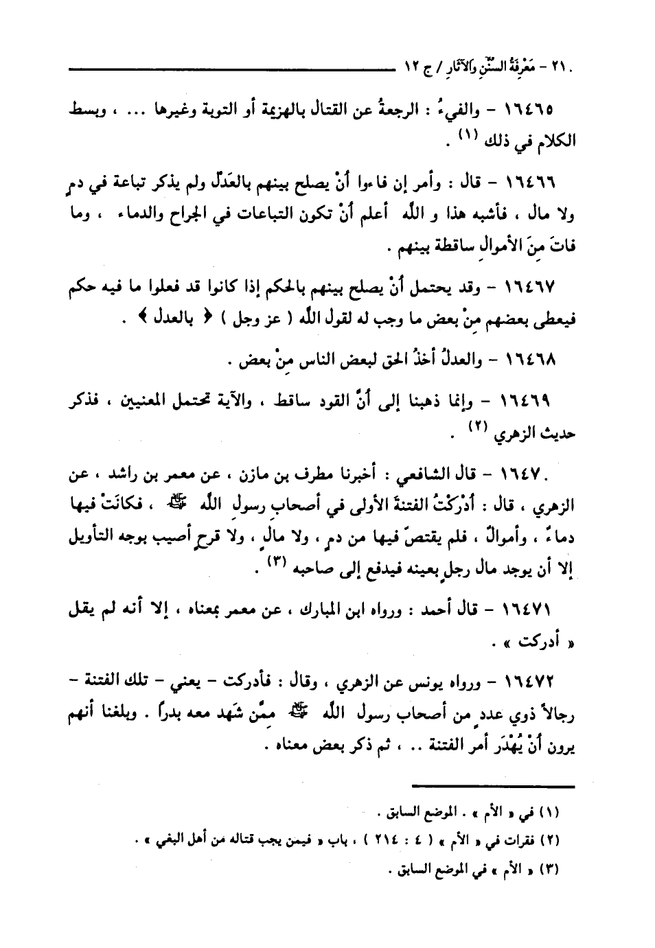 16470 - قَالَ الشَّافِعِيُّ: أَخْبَرَنَا مُطَرِّفُ بْنُ مَازِنٍ , عَنْ مَعْمَرِ بْنِ رَاشِدٍ , عَنِ الزُّهْرِيِّ , قَالَ: § «أَدْرَكْتُ الْفِتْنَةَ الْأُولَى فِي أَصْحَابِ رَسُولِ اللَّهِ صَلَّى اللهُ عَلَيْهِ وَسَلَّمَ , فَكَانَتْ فِيهَا دِمَاءٌ , وَأَمْوَالٌ , فَلَمْ يَقْتَصَّ فِيهَا مِنْ دَمٍ , وَلَا مَالٍ , وَلَا قَرْحٍ أُصِيبَ بِوَجْهِ التَّأْوِيلِ إِلَّا أَنْ يُوجَدَ مَالُ رَجُلٍ بِعَيْنِهِ , فَيُدْفَعَ إِلَى صَاحِبِهِ» ,