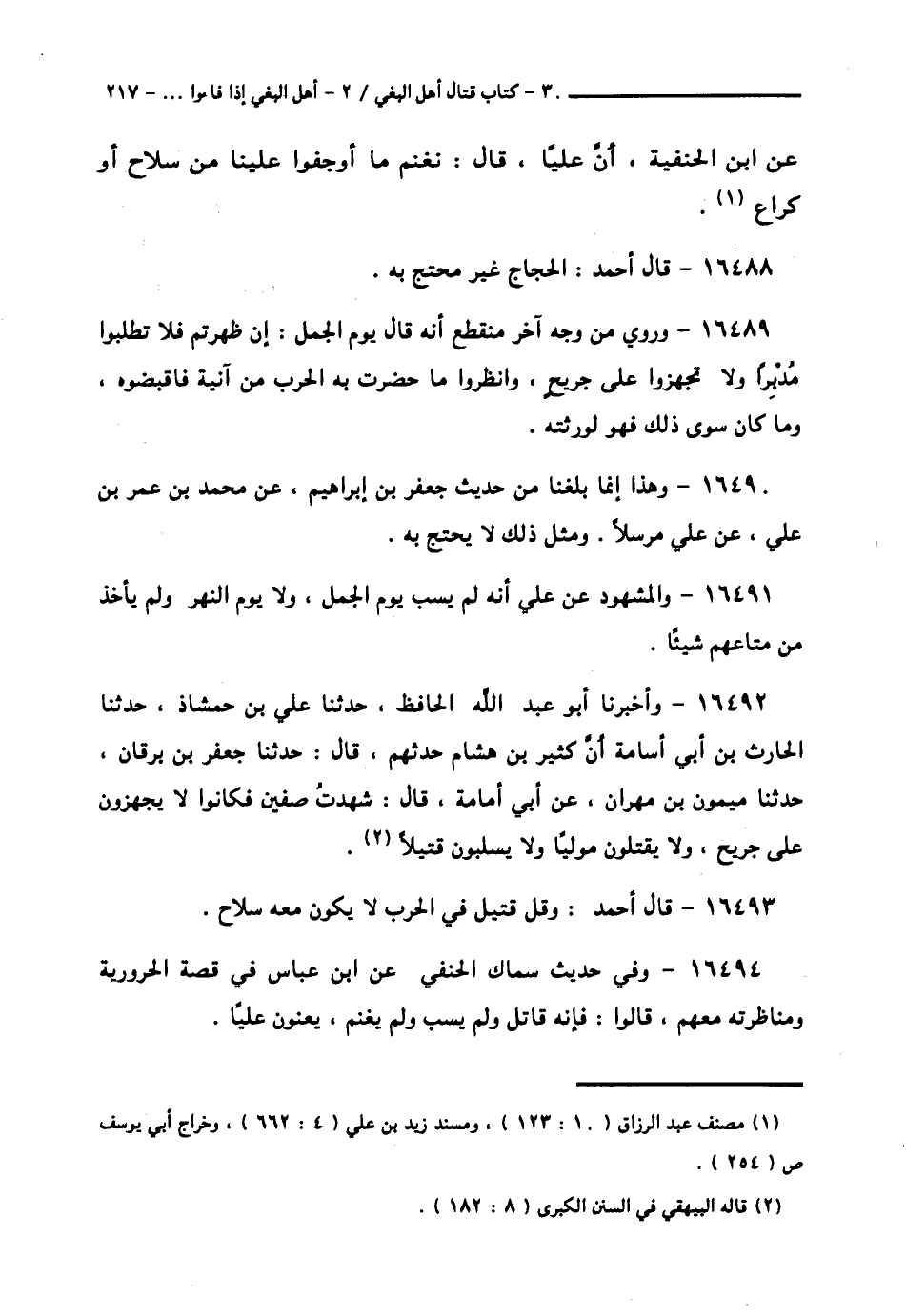 16492 - وَأَخْبَرَنَا أَبُو عَبْدِ اللَّهِ الْحَافِظُ , حَدَّثَنَا عَلِيُّ بْنُ حَمْشَاذٍ , حَدَّثَنَا الْحَارِثُ بْنُ أَبِي أُسَامَةَ , أَنَّ كَثِيرَ بْنَ هِشَامٍ , حَدَّثَهُمْ قَالَ: حَدَّثَنَا جَعْفَرُ بْنُ بُرْقَانَ , حَدَّثَنَا مَيْمُونُ بْنُ مِهْرَانَ , عَنْ أَبِي أُمَامَةَ , قَالَ: §" شَهِدْتُ صِفِّينَ فَكَانُوا لَا يُجْهِزُونَ عَلَى جَرِيحٍ , وَلَا يَقْتُلُونَ مُوَلِّيًا , وَلَا يَسْلُبُونَ قَتِيلًا ,