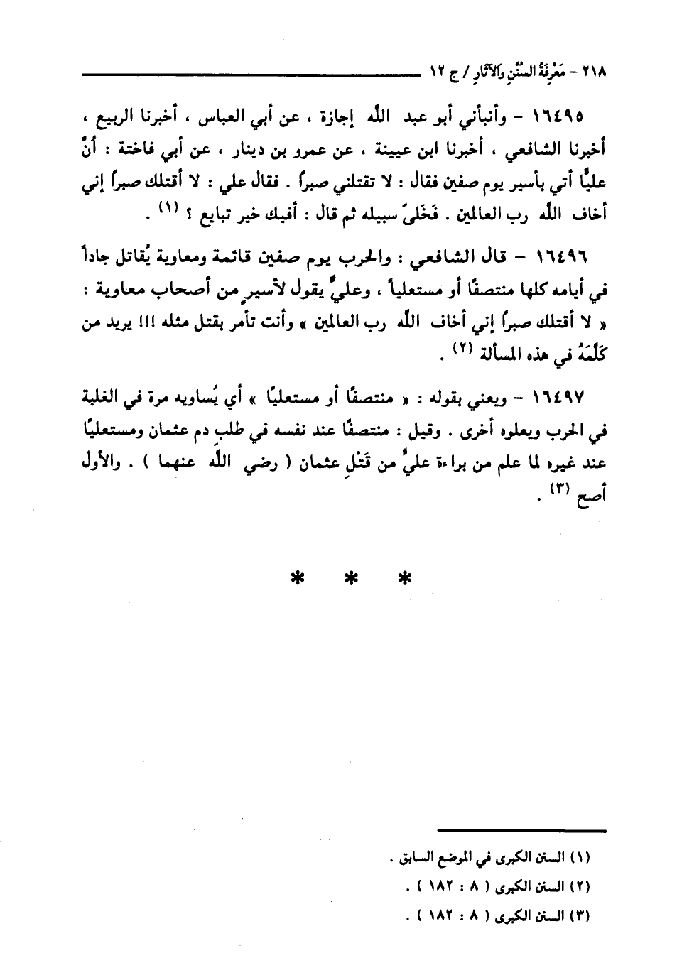 16496 - قَالَ الشَّافِعِيُّ: وَالْحَرْبُ يَوْمَ صِفِّينَ قَائِمَةٌ وَمُعَاوِيَةُ يُقَاتِلُ جَادًّا فِي أَيَّامِهِ كُلِّهَا مُنْتَصِفًا أَوْ مُسْتَعْلِيًا , وَعَلِيٌّ يَقُولُ لِأَسِيرٍ مِنْ أَصْحَابِ مُعَاوِيَةَ: «لَا أَقْتُلُكَ صَبْرًا إِنِّي أَخَافُ اللَّهَ رَبَّ الْعَالَمِينَ» وَأَنْتَ تَأْمُرُ بِقَتْلِ مِثْلِهِ يُرِيدُ مَنْ كَلَّمَهُ فِي هَذِهِ الْمَسْأَلَةِ ,