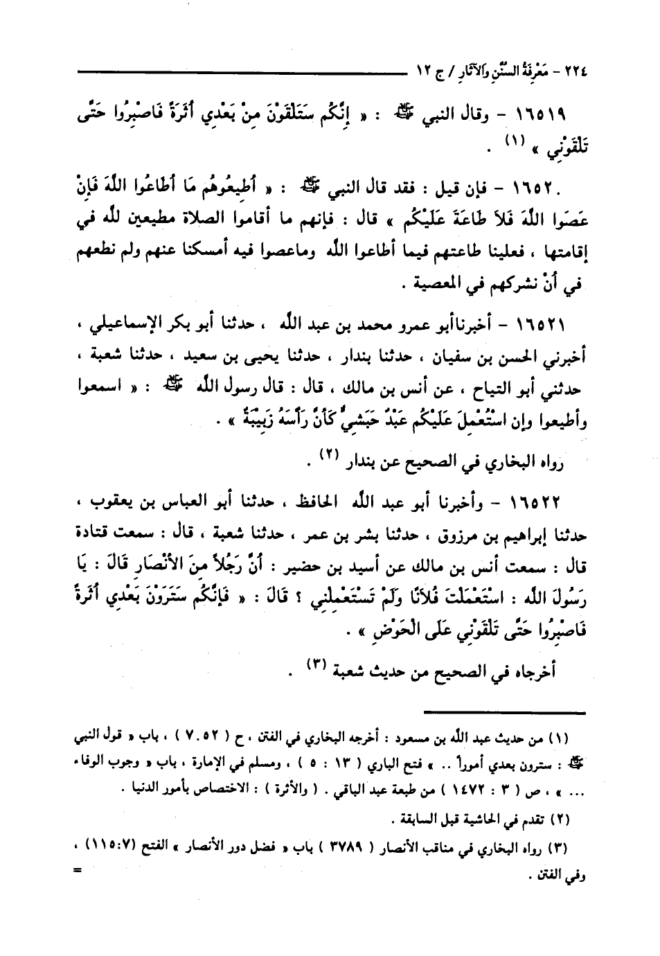 16522 - وَأَخْبَرَنَا أَبُو عَبْدِ اللَّهِ الْحَافِظُ , حَدَّثَنَا أَبُو الْعَبَّاسِ بْنُ يَعْقُوبَ , حَدَّثَنَا إِبْرَاهِيمُ بْنُ مَرْزُوقٍ , حَدَّثَنَا بِشْرُ بْنُ عُمَرَ , حَدَّثَنَا شُعْبَةُ , قَالَ: سَمِعْتُ قَتَادَةَ , قَالَ: سَمِعْتُ أَنَسَ بْنَ مَالِكٍ , عَنْ أُسَيْدِ بْنِ حُضَيْرٍ: أَنَّ رَجُلًا مِنَ الْأَنْصَارِ قَالَ: يَا رَسُولَ اللَّهِ: اسْتَعْمَلْتَ فُلَانًا وَلَمْ تَسْتَعْمِلْنِي؟ قَالَ: «§فَإِنَّكُمْ سَتَرَوْنَ بَعْدِي أَثَرَةً , فَاصْبِرُوا حَتَّى تَلْقَوْنِي عَلَى الْحَوْضِ» أَخْرَجَاهُ فِي الصَّحِيحِ مِنْ حَدِيثِ شُعْبَةَ -[225]-