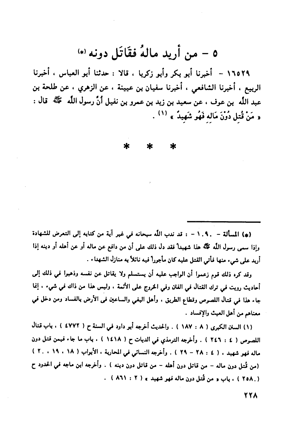 16529 - أَخْبَرَنَا أَبُو بَكْرٍ , وَأَبُو زَكَرِيَّا , قَالَا: حَدَّثَنَا أَبُو الْعَبَّاسِ , أَخْبَرَنَا الرَّبِيعُ , أَخْبَرَنَا الشَّافِعِيُّ , أَخْبَرَنَا سُفْيَانُ بْنُ عُيَيْنَةَ , عَنِ الزُّهْرِيِّ , عَنْ طَلْحَةَ بْنِ عَبْدِ اللَّهِ بْنِ عَوْفٍ , عَنْ سَعِيدِ بْنِ زَيْدِ بْنِ عَمْرِو بْنِ نُفَيْلٍ , أَنَّ رَسُولَ اللَّهِ صَلَّى اللهُ عَلَيْهِ وَسَلَّمَ قَالَ: § «مَنْ قُتِلَ دُونَ مَالِهِ فَهُوَ شَهِيدٌ»
