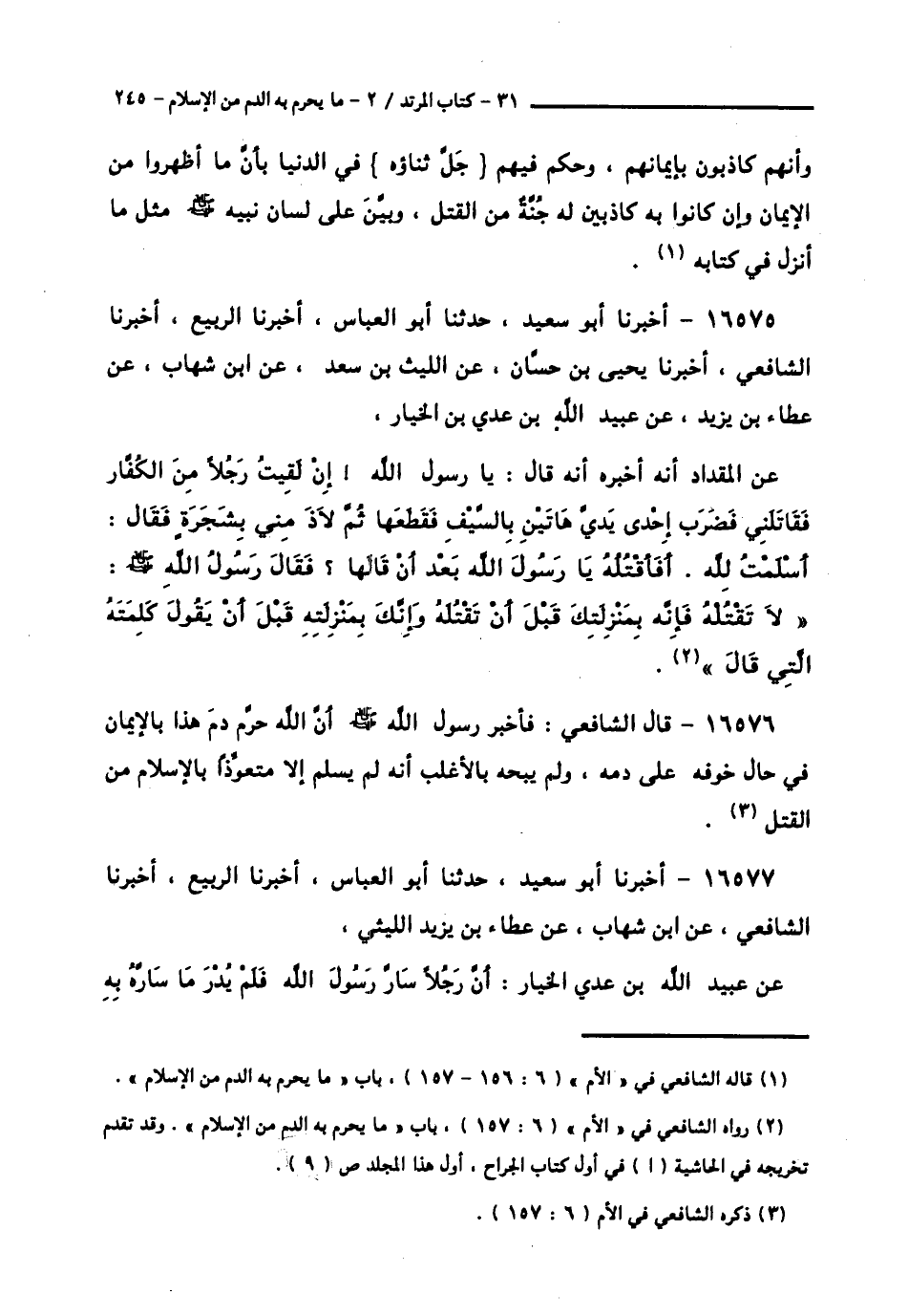 16575 - أَخْبَرَنَا أَبُو سَعِيدٍ , حَدَّثَنَا أَبُو الْعَبَّاسِ , أَخْبَرَنَا الرَّبِيعُ , أَخْبَرَنَا الشَّافِعِيُّ , أَخْبَرَنَا يَحْيَى بْنُ حَسَّانَ , عَنِ اللَّيْثِ بْنِ سَعْدٍ , عَنِ ابْنِ شِهَابٍ , عَنْ عَطَاءِ بْنِ يَزِيدَ , عَنْ عُبَيْدِ اللَّهِ بْنِ عَدِيِّ بْنِ الْخِيَارِ , عَنِ الْمِقْدَادِ , أَنَّهُ أَخْبَرَهُ أَنَّهُ قَالَ: يَا رَسُولَ اللَّهِ إِنْ §" لَقِيتُ رَجُلًا مِنِ الْكُفَّارِ , فَقَاتَلَنِي , فَضَرَبَ إِحْدَى يَدَيَّ هَاتَيْنِ بِالسَّيْفِ فَقَطَعَهَا , ثُمَّ لَاذَ مِنِّي بِشَجَرَةٍ , فَقَالَ: أَسْلَمْتُ لِلَّهِ. أَفَأَقْتُلُهُ يَا رَسُولَ اللَّهِ بَعْدَ أَنْ قَالَهَا؟ فَقَالَ رَسُولُ اللَّهِ صَلَّى اللهُ عَلَيْهِ وَسَلَّمَ: «لَا تَقْتُلْهُ فَإِنَّهُ بِمَنْزِلَتِكَ قَبْلَ أَنْ تَقْتُلَهُ , وَإِنَّكَ بِمَنْزِلَتِهِ قَبْلَ أَنْ يَقُولَ كَلِمَتَهُ الَّتِي قَالَ» ,