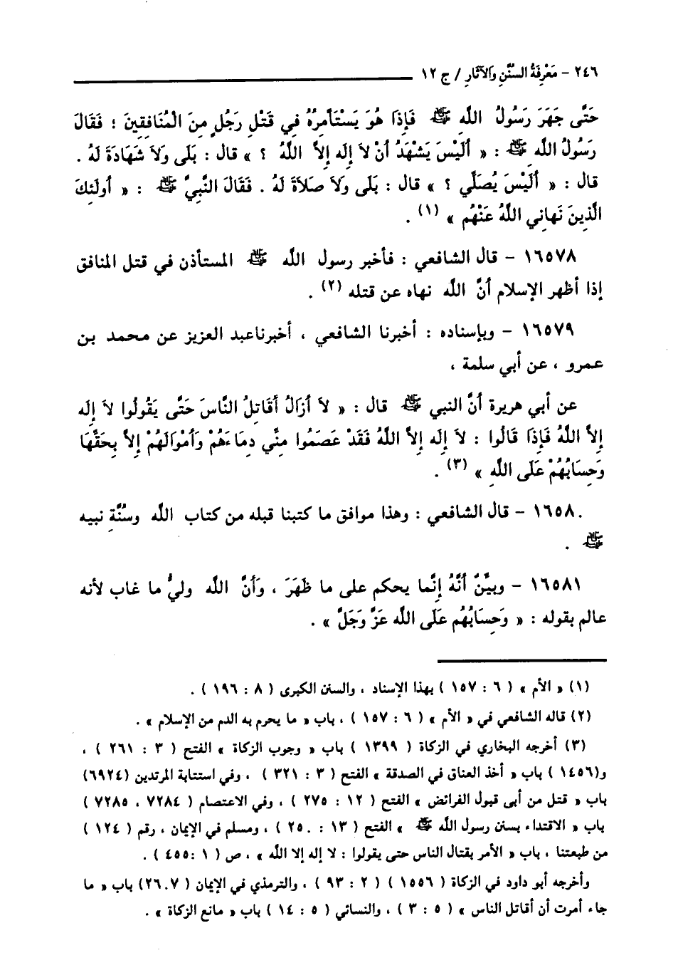 16579 - وَبِإِسْنَادِهِ: أَخْبَرَنَا الشَّافِعِيُّ , أَخْبَرَنَا عَبْدُ الْعَزِيزِ , عَنْ مُحَمَّدِ بْنِ عَمْرٍو , عَنْ أَبِي سَلَمَةَ , عَنْ أَبِي هُرَيْرَةَ , أَنَّ النَّبِيَّ صَلَّى اللهُ عَلَيْهِ وَسَلَّمَ قَالَ: § «لَا أَزَالُ أُقَاتِلُ النَّاسَ حَتَّى يَقُولُوا لَا إِلَهَ إِلَّا اللَّهُ , فَإِذَا قَالُوا لَا إِلَهَ إِلَّا اللَّهُ , فَقَدْ عَصَمُوا مِنِّي دِمَاءَهُمْ وَأَمْوَالَهُمْ , إِلَّا بِحَقِّهَا وَحِسَابُهُمْ عَلَى اللَّهِ» ,