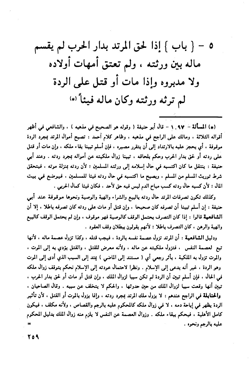 §بَابُ إِذَا لَحِقَ الْمُرْتَدُّ بِدَارِ الْحَرْبِ لَمْ يُقْسَمْ مَالُهُ بَيْنَ وَرَثَتِهِ , وَلَمْ تَعْتِقْ أُمَّهَاتُ أَوْلَادِهِ وَلَا مُدَبَّرُوهُ , وَإِذَا مَاتَ أَوْ قُتِلَ عَلَى الرِّدَّةِ لَمْ تَرِثْهُ وَرَثَتُهُ , وَكَانَ مَالُهُ فَيْئًا -[260]-،