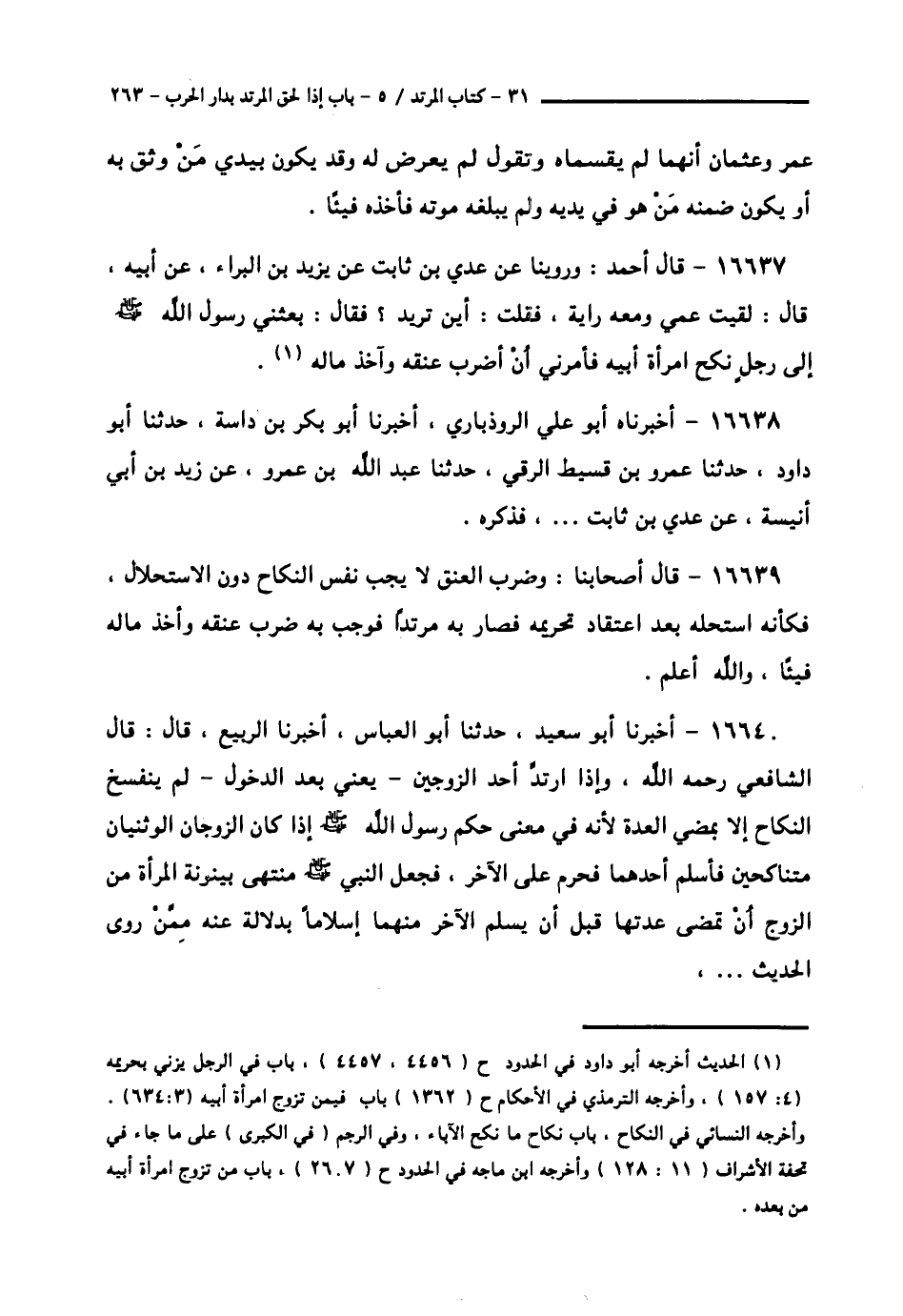 16637 - قَالَ أَحْمَدُ: وَرُوِّينَا عَنْ عَدِيِّ بْنِ ثَابِتٍ , عَنْ يَزِيدَ بْنِ الْبَرَاءِ , عَنْ أَبِيهِ , قَالَ: " لَقِيتُ عَمِّي وَمَعَهُ رَايَةٌ , فَقُلْتُ: أَيْنَ تُرِيدُ؟ فَقَالَ: §بَعَثَنِي رَسُولُ اللَّهِ صَلَّى اللهُ عَلَيْهِ وَسَلَّمَ إِلَى رَجُلٍ نَكَحَ امْرَأَةَ أَبِيهِ , فَأَمَرَنِي أَنْ أَضْرِبَ عُنُقَهُ وَآخُذَ مَالَهُ " ,