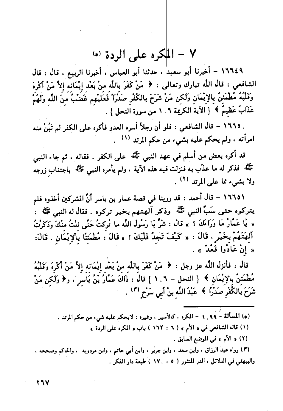 16649 - أَخْبَرَنَا أَبُو سَعِيدٍ , حَدَّثَنَا أَبُو الْعَبَّاسِ , أَخْبَرَنَا الرَّبِيعُ , قَالَ: قَالَ الشَّافِعِيُّ: قَالَ اللَّهُ تَبَارَكَ وَتَعَالَى: " {مَنْ كَفَرَ بِاللَّهِ مِنْ بَعْدِ إِيمَانِهِ إِلَّا مَنْ أُكْرِهَ وَقَلْبُهُ مُطْمَئِنٌّ بِالْإِيمَانِ وَلَكِنْ مَنْ شَرَحَ بِالْكُفْرِ صَدْرًا فَعَلَيْهِمْ غَضَبٌ مِنَ اللَّهِ وَلَهُمْ عَذَابٌ عَظِيمٌ} [النحل: 106] " ,