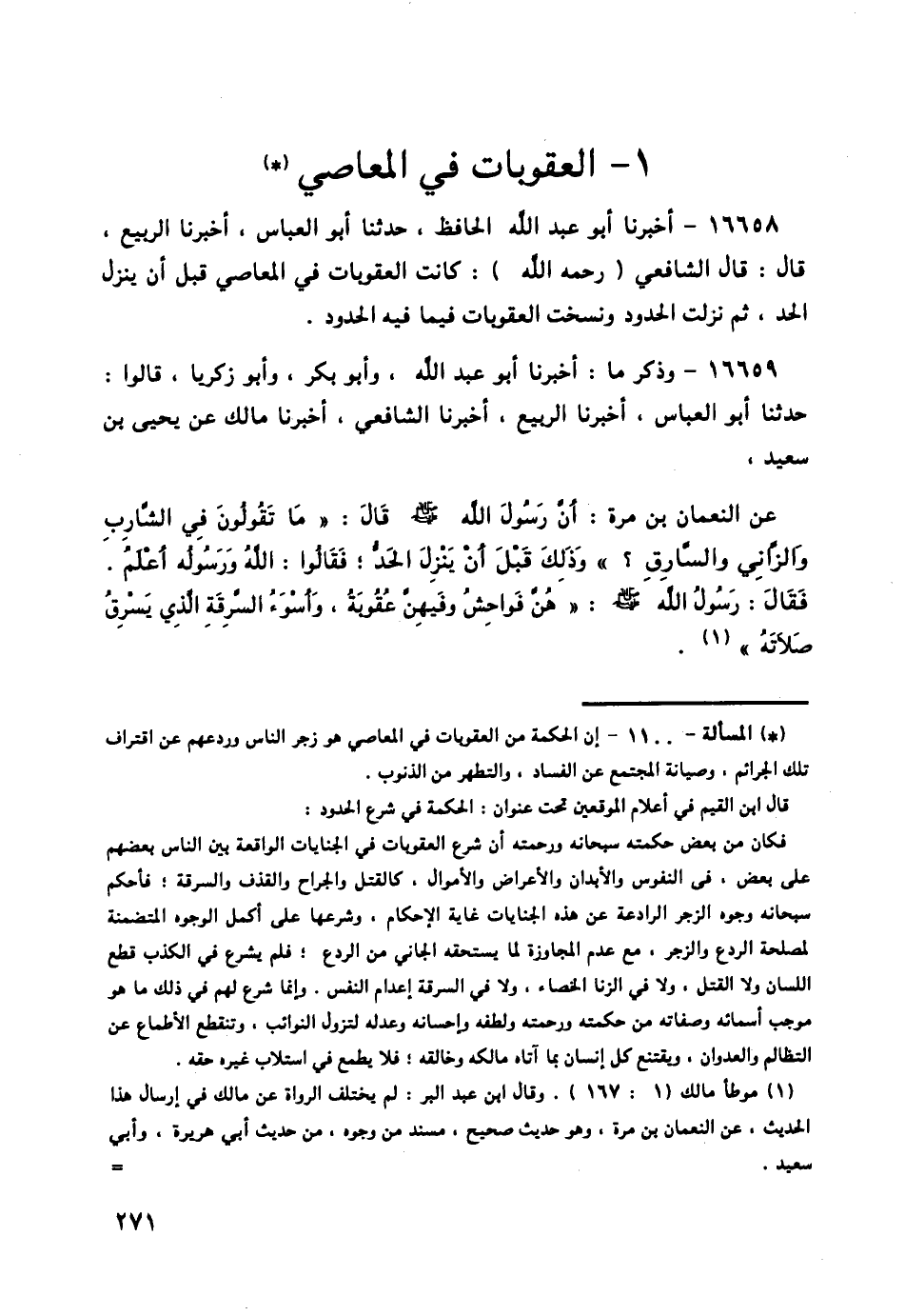 16659 - وَذَكَرَ مَا أَخْبَرَنَا أَبُو عَبْدِ اللَّهِ , وَأَبُو بَكْرٍ , وَأَبُو زَكَرِيَّا , قَالُوا: حَدَّثَنَا أَبُو الْعَبَّاسِ , أَخْبَرَنَا الرَّبِيعُ , أَخْبَرَنَا الشَّافِعِيُّ , أَخْبَرَنَا مَالِكٌ , عَنْ يَحْيَى بْنِ سَعِيدٍ , عَنِ النُّعْمَانِ بْنِ مُرَّةَ: أَنَّ رَسُولَ اللَّهِ صَلَّى اللهُ عَلَيْهِ وَسَلَّمَ قَالَ: § «مَا تَقُولُونَ فِي الشَّارِبِ , وَالزَّانِي , وَالسَّارِقِ؟» وَذَلِكَ قَبْلَ أَنْ يَنْزِلَ الْحَدُّ , فَقَالُوا: اللَّهُ وَرَسُولُهُ أَعْلَمُ. فَقَالَ رَسُولُ اللَّهِ صَلَّى اللهُ عَلَيْهِ وَسَلَّمَ: «هُنَّ فَوَاحِشُ وَفِيهِنَّ عُقُوبَةٌ , وَأَسْوَأُ السَّرِقَةِ الَّذِي يَسْرِقُ صَلَاتَهُ» -[272]- قَالَ: ثُمَّ سَاقَ الْحَدِيثَ ,