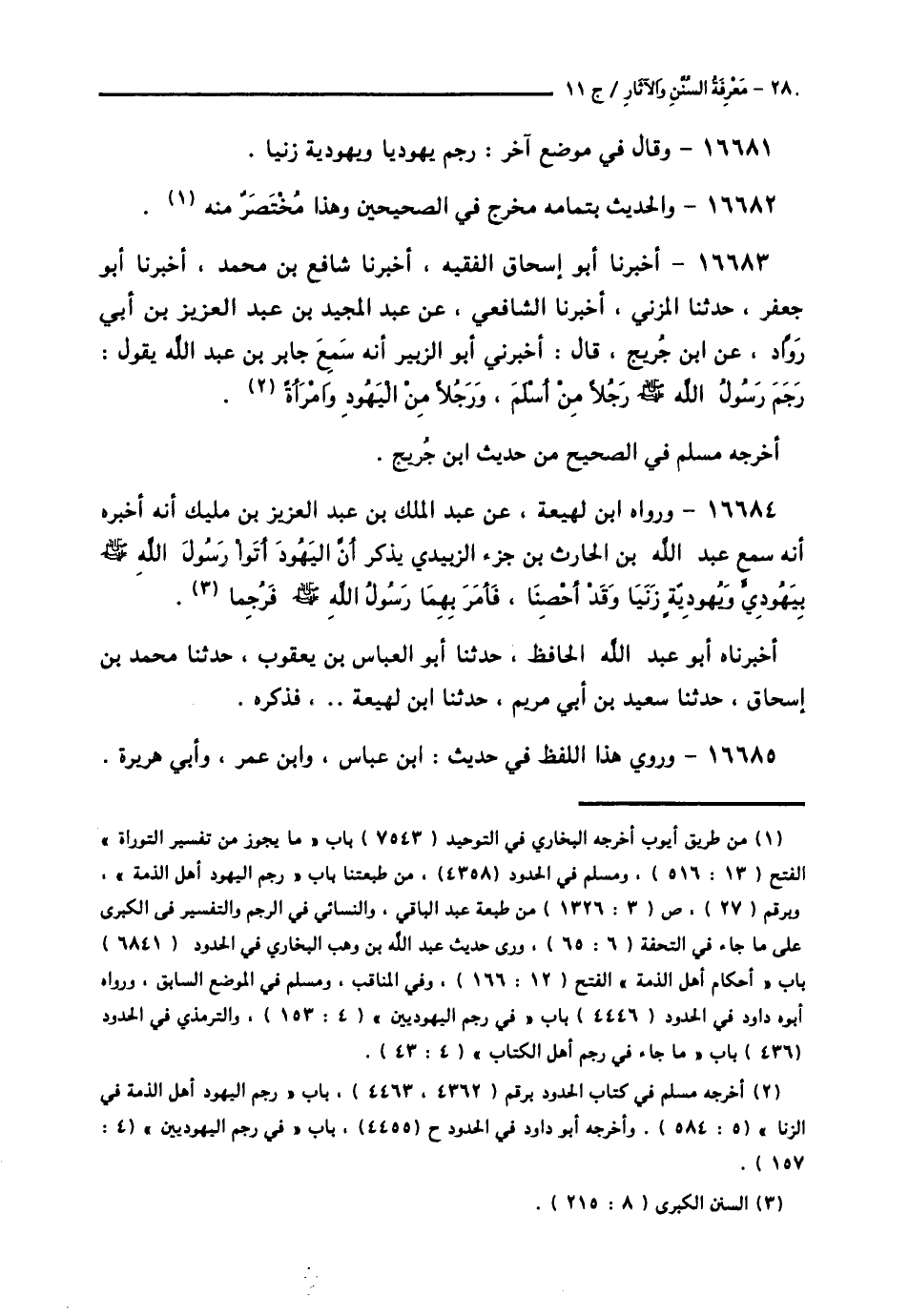 16683 - أَخْبَرَنَا أَبُو إِسْحَاقَ الْفَقِيهُ , أَخْبَرَنَا شَافِعُ بْنُ مُحَمَّدٍ , أَخْبَرَنَا أَبُو جَعْفَرٍ , حَدَّثَنَا الْمُزَنِيُّ , أَخْبَرَنَا الشَّافِعِيُّ , عَنْ عَبْدِ الْمَجِيدِ بْنِ عَبْدِ الْعَزِيزِ بْنِ أَبِي رَوَّادٍ , عَنِ ابْنِ جُرَيْجٍ , قَالَ: أَخْبَرَنِي أَبُو الزُّبَيْرِ , أَنَّهُ سَمِعَ جَابِرَ بْنَ عَبْدِ اللَّهِ , يَقُولُ: § «رَجَمَ رَسُولُ اللَّهِ صَلَّى اللهُ عَلَيْهِ وَسَلَّمَ رَجُلًا مِنْ أَسْلَمَ , وَرَجُلًا مِنَ الْيَهُودِ وَامْرَأَةً» وَأَخْرَجَهُ مُسْلِمٌ فِي الصَّحِيحِ مِنْ حَدِيثِ ابْنِ جُرَيْجٍ