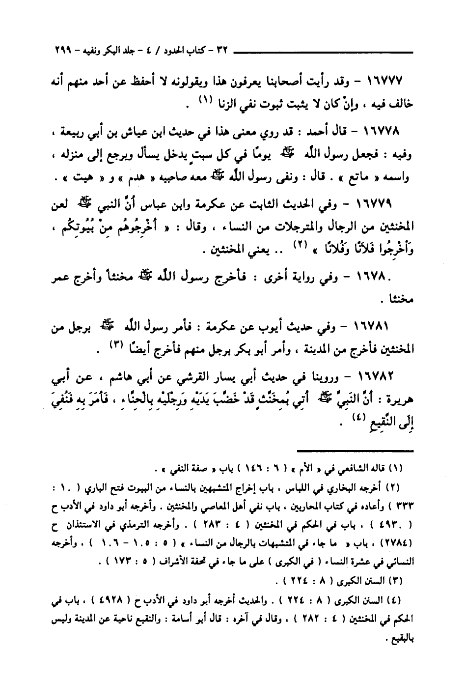 16782 - وَرُوِّينَا فِي , حَدِيثِ أَبِي يَسَارٍ الْقُرَشِيِّ , عَنْ أَبِي هَاشِمٍ , عَنْ أَبِي هُرَيْرَةَ , أَنَّ النَّبِيَّ صَلَّى اللهُ عَلَيْهِ وَسَلَّمَ § «أُتِيَ بِمُخَنَّثٍ قَدْ خَضَّبَ يَدَيْهِ وَرِجْلَيْهِ بِالْحِنَّاءِ , فَأَمَرَ بِهِ , فَنُفِيَ إِلَى النَّقِيعِ» -[300]- أَخْبَرَنَاهُ أَبُو عَلِيٍّ الرُّوذْبَارِيُّ , أَخْبَرَنَا أَبُو بَكْرِ بْنُ دَاسَةَ , حَدَّثَنَا أَبُو دَاوُدَ , حَدَّثَنَا هَارُونُ بْنُ عَبْدِ اللَّهِ , عَنْ أَبِي أُسَامَةَ , عَنْ مُفَضَّلِ بْنِ يُونُسَ , عَنِ الْأَوْزَاعِيِّ , عَنْ أَبِي يَسَارٍ الْقُرَشِيِّ. . . فَذَكَرَهُ أَتَمَّ مِنْ ذَلِكَ