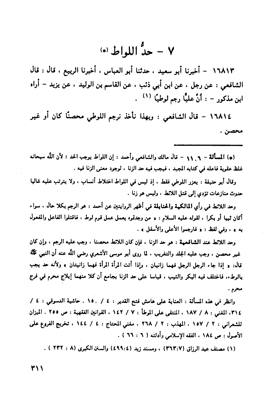 16816 - قَالَ الشَّافِعِيُّ: وَصَاحِبُهُمْ يَقُولُ: لَيْسَ عَلَى اللُّوطِيِّ حَدٌّ , وَلَوْ تَلَوَّطَ وَهُوَ مُحْرِمٌ لَمْ يَفْسُدْ إِحْرَامُهُ , وَلَا غُسْلَ عَلَيْهِ مَا لَمْ يُمْنِ , وَقَدْ خَالَفَهُ بَعْضُ أَصْحَابِهِ , فَقَالَ: اللُّوطِيُّ مِثْلُ الزَّانِي ,
