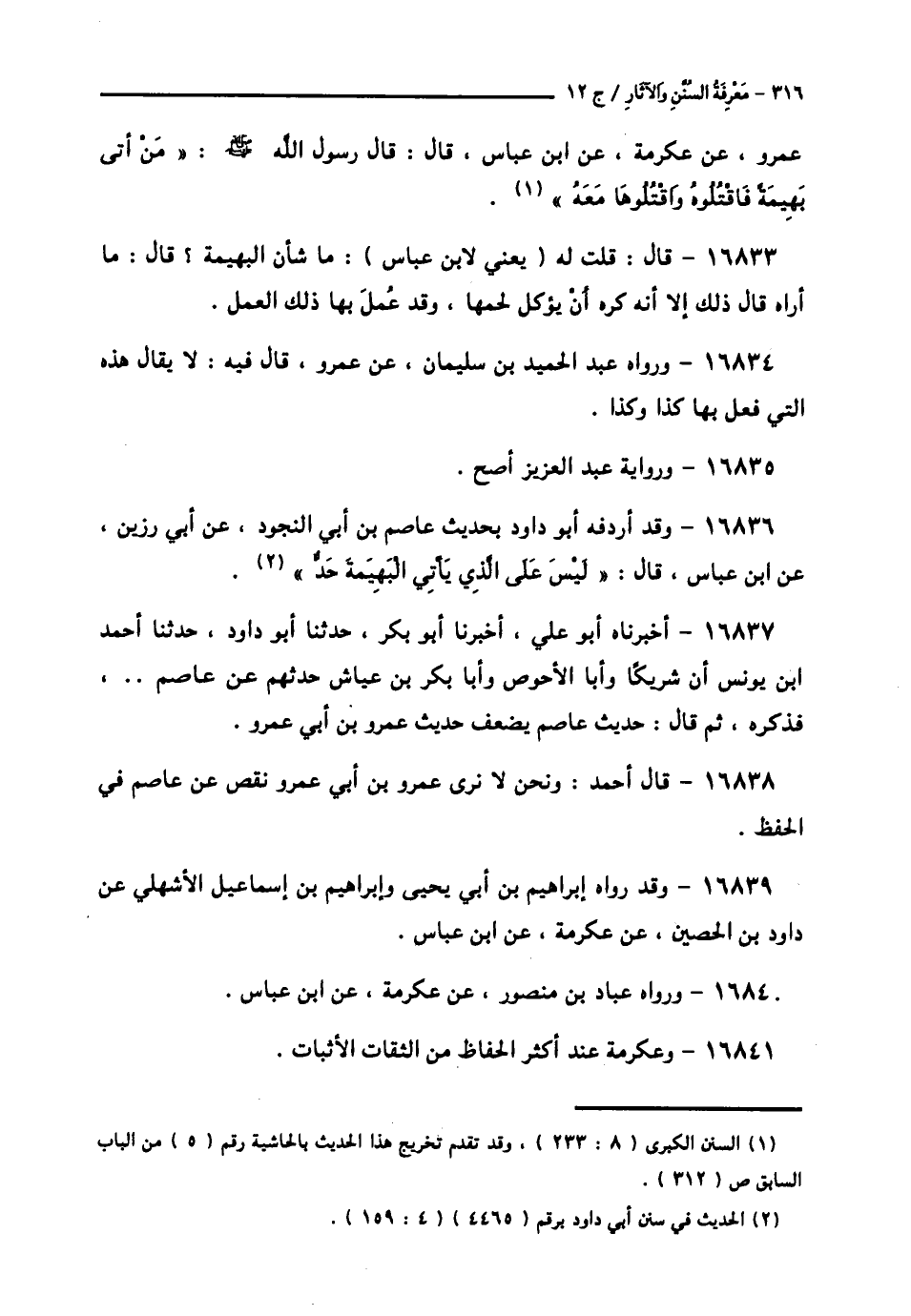 16836 - وَقَدْ أَرْدَفَهُ أَبُو دَاوُدَ بِحَدِيثِ عَاصِمِ بْنِ أَبِي النَّجُودِ , عَنْ أَبِي رَزِينٍ , عَنِ ابْنِ عَبَّاسٍ , قَالَ: § «لَيْسَ عَلَى الَّذِي يَأْتِي بَهِيمَةً حَدٌّ» ,