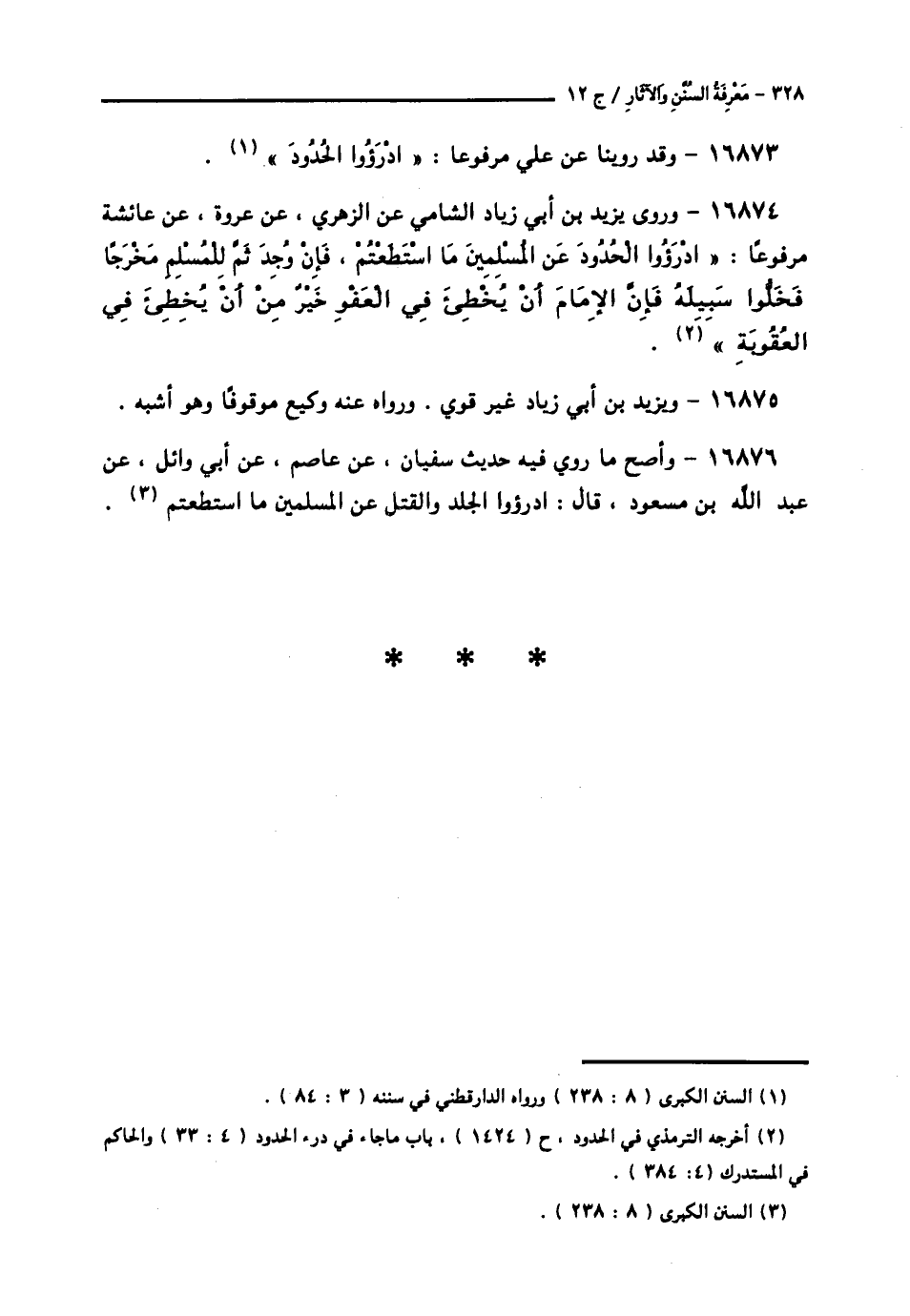 16876 - وَأَصَحُّ مَا رُوِيَ فِيهِ , حَدِيثُ سُفْيَانَ , عَنْ عَاصِمٍ , عَنْ أَبِي وَائِلٍ , عَنْ عَبْدِ اللَّهِ بْنِ مَسْعُودٍ , قَالَ: § «ادْرَءُوا الْجَلْدَ وَالْقَتْلَ عَنِ الْمُسْلِمِينَ مَا اسْتَطَعْتُمْ»