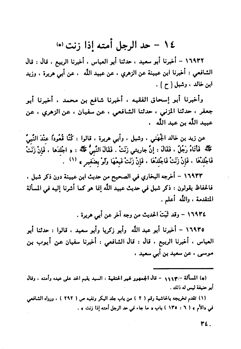 16932 - أَخْبَرَنَا أَبُو سَعِيدٍ , حَدَّثَنَا أَبُو الْعَبَّاسِ , أَخْبَرَنَا الرَّبِيعُ , قَالَ: قَالَ الشَّافِعِيُّ: أَخْبَرَنَا ابْنُ عُيَيْنَةَ , عَنِ الزُّهْرِيِّ , عَنْ عُبَيْدِ اللَّهِ , عَنْ أَبِي هُرَيْرَةَ , وَزَيْدِ بْنِ خَالِدٍ , وَشِبْلٍ , ح وَأَخْبَرَنَا أَبُو إِسْحَاقَ الْفَقِيهُ , أَخْبَرَنَا شَافِعُ بْنُ مُحَمَّدٍ , أَخْبَرَنَا أَبُو جَعْفَرٍ , حَدَّثَنَا الْمُزَنِيُّ , حَدَّثَنَا الشَّافِعِيُّ , عَنْ سُفْيَانَ , عَنِ الزُّهْرِيِّ , عَنْ عُبَيْدِ اللَّهِ بْنِ عَبْدِ اللَّهِ , عَنْ زَيْدِ بْنِ خَالِدٍ الْجُهَنِيِّ , وَشِبْلٍ , وَأَبِي هُرَيْرَةَ , قَالُوا: كُنَّا قُعُودًا عِنْدَ النَّبِيِّ صَلَّى اللهُ عَلَيْهِ وَسَلَّمَ , فَأَتَاهُ رَجُلٌ , فَقَالَ: §إِنَّ جَارِيَتِي زَنَتْ , فَقَالَ النَّبِيُّ صَلَّى اللهُ عَلَيْهِ وَسَلَّمَ: «اجْلِدْهَا , فَإِنْ زَنَتْ فَاجْلِدْهَا , فَإِنْ زَنَتْ فَاجْلِدْهَا , فَإِنْ زَنَتْ فَبِعْهَا وَلَوْ بِضَفِيرٍ»
