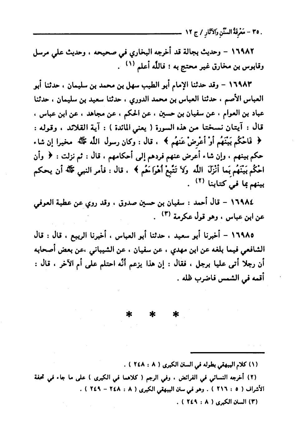 16983 - وَقَدْ حَدَّثَنَا الْإِمَامُ أَبُو الطِّيِّبِ سَهْلُ بْنُ مُحَمَّدِ بْنِ سُلَيْمَانَ , حَدَّثَنَا أَبُو الْعَبَّاسِ الْأَصَمُّ , حَدَّثَنَا الْعَبَّاسُ بْنُ مُحَمَّدٍ الدُّورِيُّ , حَدَّثَنَا سَعِيدُ بْنُ سُلَيْمَانَ , حَدَّثَنَا عَبَّادُ بْنُ الْعَوَّامِ , عَنْ سُفْيَانَ بْنِ حُسَيْنٍ , عَنِ الْحَكَمِ , عَنْ مُجَاهِدٍ , عَنِ ابْنِ عَبَّاسٍ , قَالَ: " §آيَتَانِ نُسِخَتَا مِنْ هَذِهِ السُّورَةِ يَعْنِي الْمَائِدَةَ: آيَةُ الْقَلَائِدِ , قَوْلُهُ: {فَاحْكُمْ بَيْنَهُمْ أَوْ أَعْرِضْ عَنْهُمْ} [المائدة: 42] , قَالَ: وَكَانَ رَسُولُ اللَّهِ صَلَّى اللهُ عَلَيْهِ وَسَلَّمَ مُخَيَّرًا إِنْ شَاءَ حَكَمَ بَيْنَهُمْ , وَإِنْ شَاءَ أَعْرَضَ عَنْهُمْ فَرَدَّهُمْ إِلَى أَحْكَامِهِمْ , قَالَ: ثُمَّ نَزَلَتْ: {وَأَنِ احْكُمْ بَيْنَهُمْ بِمَا أَنْزَلَ اللَّهُ وَلَا تَتَّبِعْ أَهْوَاءَهُمْ} [المائدة: 49] فَأَمَرَ النَّبِيَّ صَلَّى اللهُ عَلَيْهِ وَسَلَّمَ أَنْ يَحْكُمَ بَيْنَهُمْ بِمَا فِي كِتَابِنَا " ,