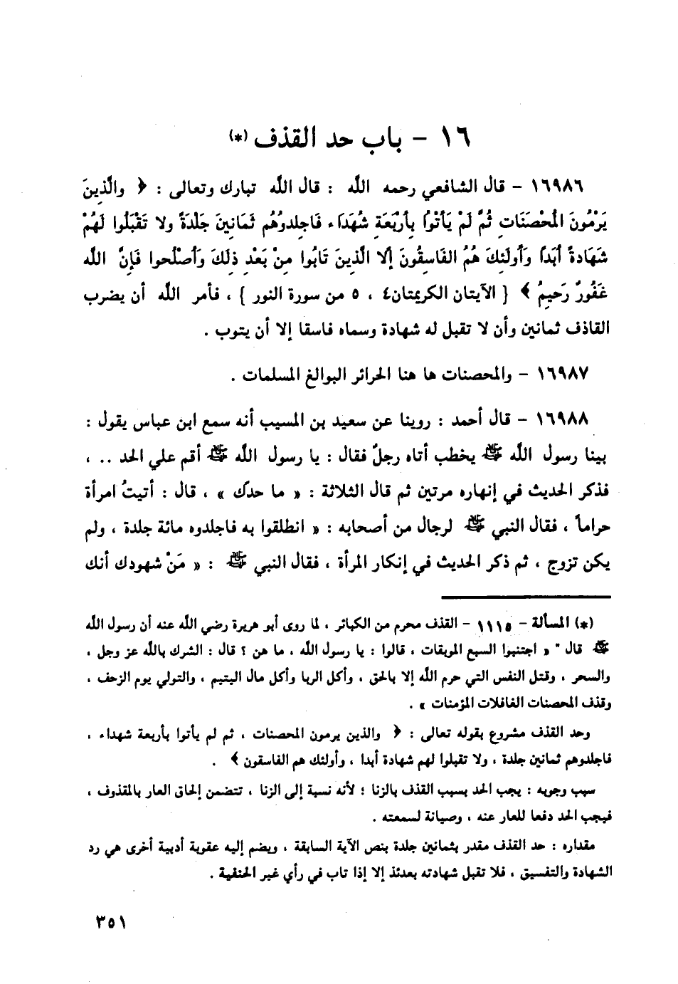 16986 - قَالَ الشَّافِعِيُّ رَحِمَهُ اللَّهُ: قَالَ اللَّهُ تَبَارَكَ وَتَعَالَى: " {وَالَّذِينَ يَرْمُونَ الْمُحْصَنَاتِ ثُمَّ لَمْ يَأْتُوا بِأَرْبَعَةِ شُهَدَاءَ فَاجْلِدُوهُمْ ثَمَانِينَ جَلْدَةً وَلَا تَقْبَلُوا لَهُمْ شَهَادَةً أَبَدًا وَأُولَئِكَ هُمُ الْفَاسِقُونَ إِلَّا الَّذِينَ تَابُوا مِنْ بَعْدِ ذَلِكَ وَأَصْلَحُوا فَإِنَّ اللَّهَ غَفُورٌ رَحِيمٌ} [النور: 5] فَأَمَرَ اللَّهُ أَنْ يُضْرَبَ الْقَاذِفُ ثَمَانِينَ وَأَنْ لَا تُقْبَلَ لَهُ شَهَادَةٌ وَسَمَّاهُ فَاسِقًا إِلَّا أَنْ يَتُوبَ " ,