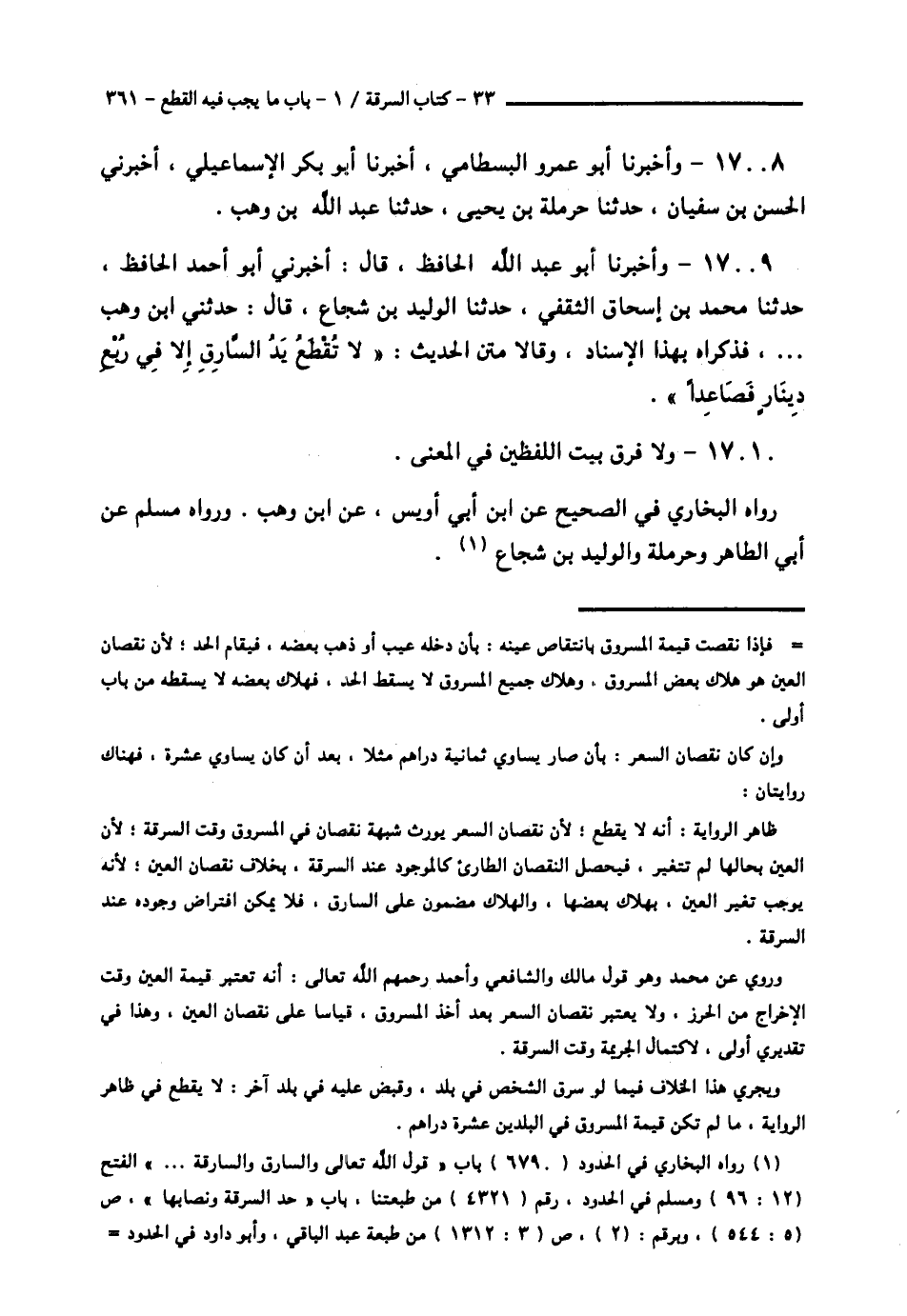 17009 - وَأَخْبَرَنَا أَبُو عَبْدِ اللَّهِ الْحَافِظُ , قَالَ: أَخْبَرَنِي أَبُو أَحْمَدَ الْحَافِظُ , حَدَّثَنَا مُحَمَّدُ بْنُ إِسْحَاقَ الثَّقَفِيُّ , حَدَّثَنَا الْوَلِيدُ بْنُ شُجَاعٍ , قَالَ: حَدَّثَنِي ابْنُ وَهْبٍ ,. . . , فَذَكَرَاهُ بِهَذَا الْإِسْنَادِ , وَقَالَا مَتْنُ الْحَدِيثِ: § «لَا تُقْطَعُ يَدُ السَّارِقِ إِلَّا فِي رُبُعِ دِينَارٍ فَصَاعِدًا» ,