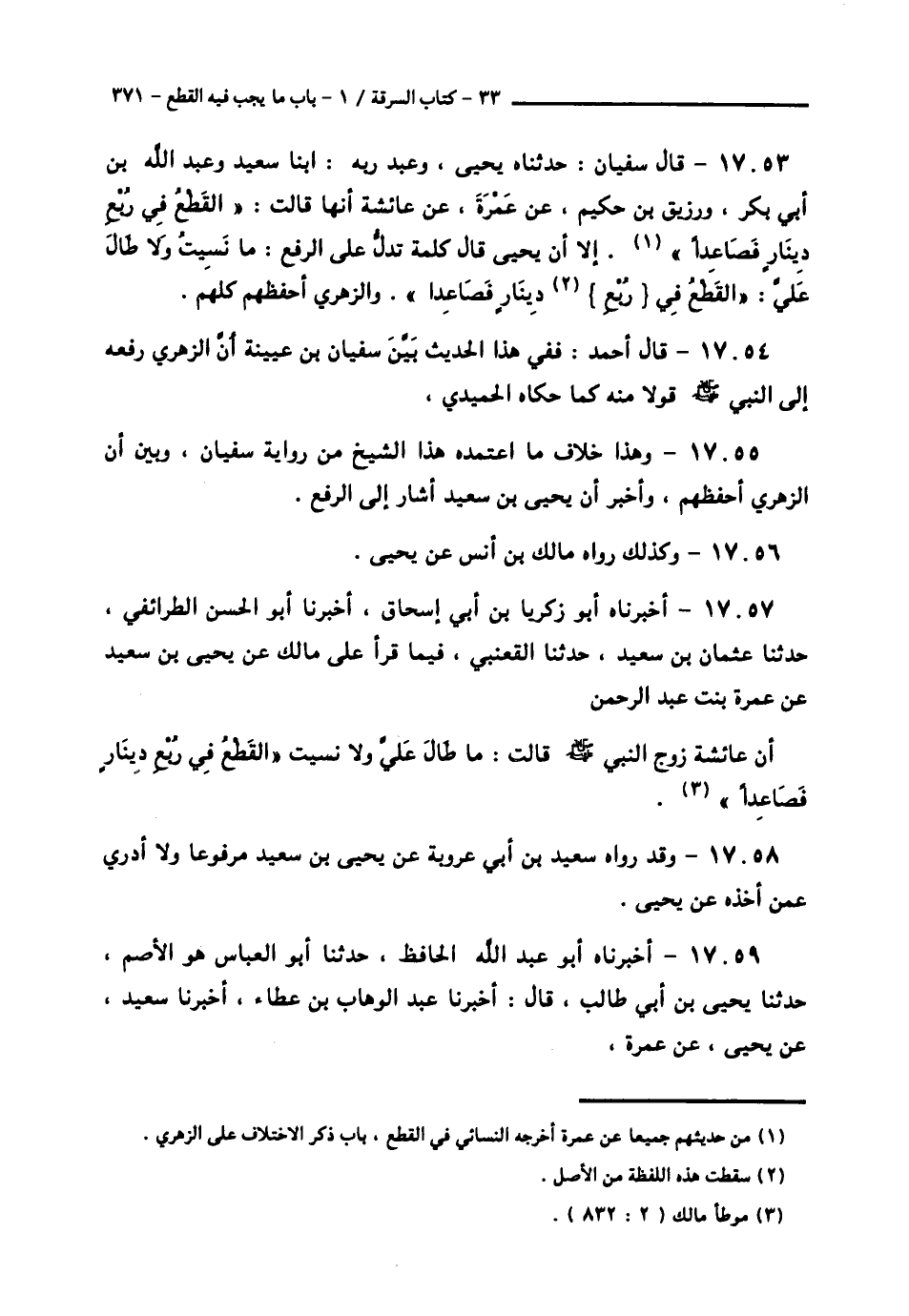 17053 - قَالَ سُفْيَانُ: حَدَّثَنَاهُ يَحْيَى , وَعَبْدُ رَبِّهِ ابْنَا سَعِيدٍ , وَعَبْدُ اللَّهِ بْنُ أَبِي بَكْرٍ , وَرُزَيْقُ بْنُ حَكِيمٍ , عَنْ عَمْرَةَ , عَنْ عَائِشَةَ , أَنَّهَا قَالَتِ: § «الْقَطْعُ فِي رُبُعِ دِينَارٍ فَصَاعِدًا» إِلَّا أَنَّ يَحْيَى قَالَ كَلِمَةً تَدُلُّ عَلَى الرَّفْعِ مَا نَسِيتُ وَلَا طَالَ عَلَيَّ: «الْقَطْعُ فِي رُبُعِ دِينَارٍ فَصَاعِدًا». وَالزُّهْرِيُّ أَحْفَظُهُمْ كُلُّهُمْ ,