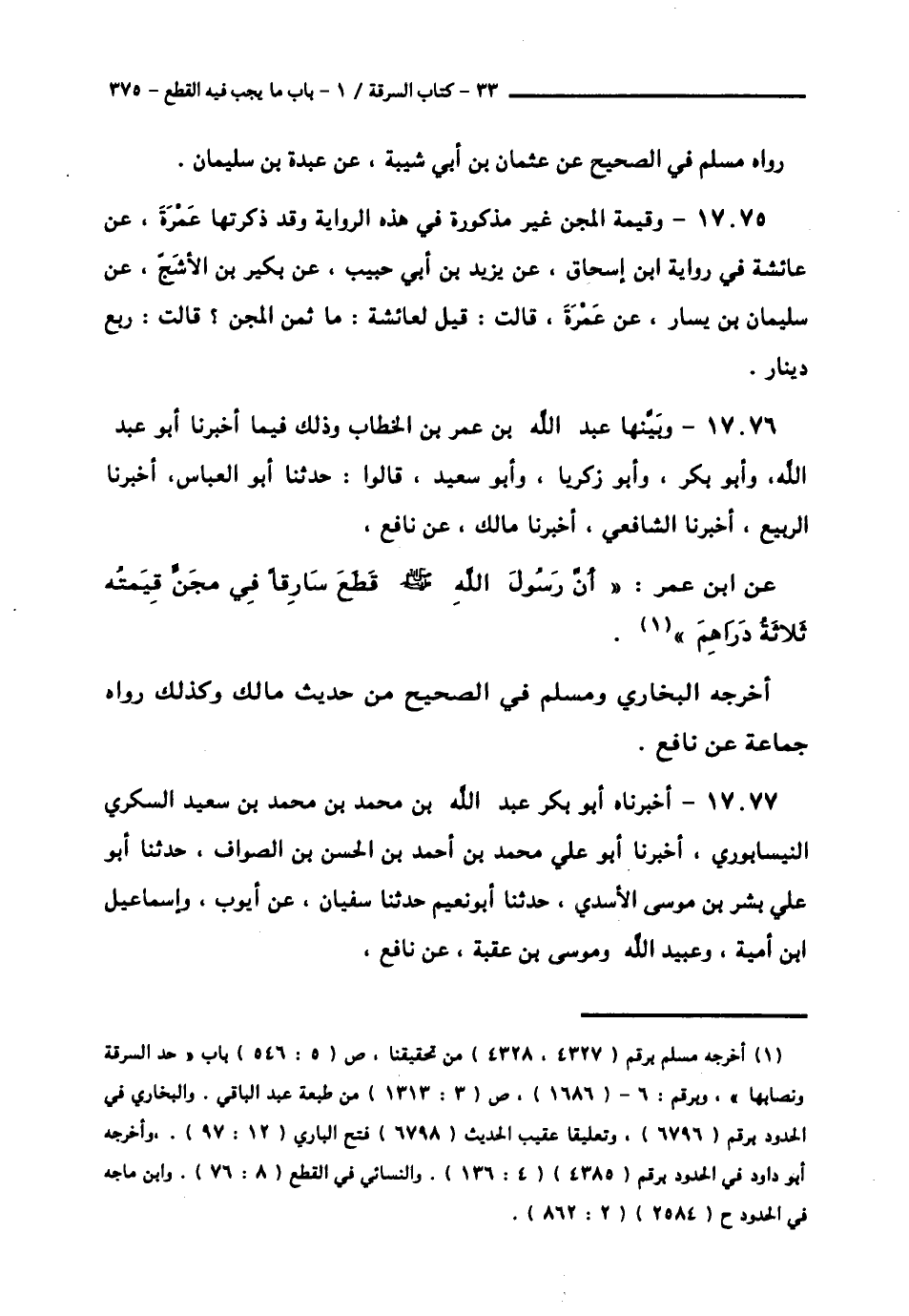 17077 - أَخْبَرَنَاهُ أَبُو بَكْرٍ عَبْدُ اللَّهِ بْنُ مُحَمَّدِ بْنِ مُحَمَّدِ بْنِ سَعِيدٍ السُّكَّرِيُّ النَّيْسَابُورِيُّ , أَخْبَرَنَا أَبُو عَلِيٍّ مُحَمَّدُ بْنُ أَحْمَدَ بْنِ الْحَسَنِ بْنِ الصَّوَّافِ , حَدَّثَنَا أَبُو عَلِيٍّ بِشْرُ بْنُ مُوسَى الْأَسَدِيُّ , حَدَّثَنَا أَبُو نُعَيْمٍ , حَدَّثَنَا سُفْيَانُ , عَنْ أَيُّوبَ , وَإِسْمَاعِيلَ بْنِ أُمَيَّةَ , وَعُبَيْدِ اللَّهِ , وَمُوسَى بْنِ عُقْبَةَ , عَنْ نَافِعٍ , -[376]- عَنِ ابْنِ عُمَرَ , أَنَّ النَّبِيَّ صَلَّى اللهُ عَلَيْهِ وَسَلَّمَ § «قَطَعَ فِي مِجَنٍّ قِيمَتُهُ ثَلَاثَةُ دَرَاهِمَ» رَوَاهُ مُسْلِمٌ فِي الصَّحِيحِ , عَنْ عَبْدِ اللَّهِ بْنِ عَبْدِ الرَّحْمَنِ , عَنْ أَبِي نُعَيْمٍ , وَأَخْرَجَهُ الْبُخَارِيُّ مِنْ وَجْهٍ آخَرَ عَنْ عُبَيْدِ اللَّهِ بْنِ عُمَرَ , وَمُوسَى بْنِ عُقْبَةَ ,
