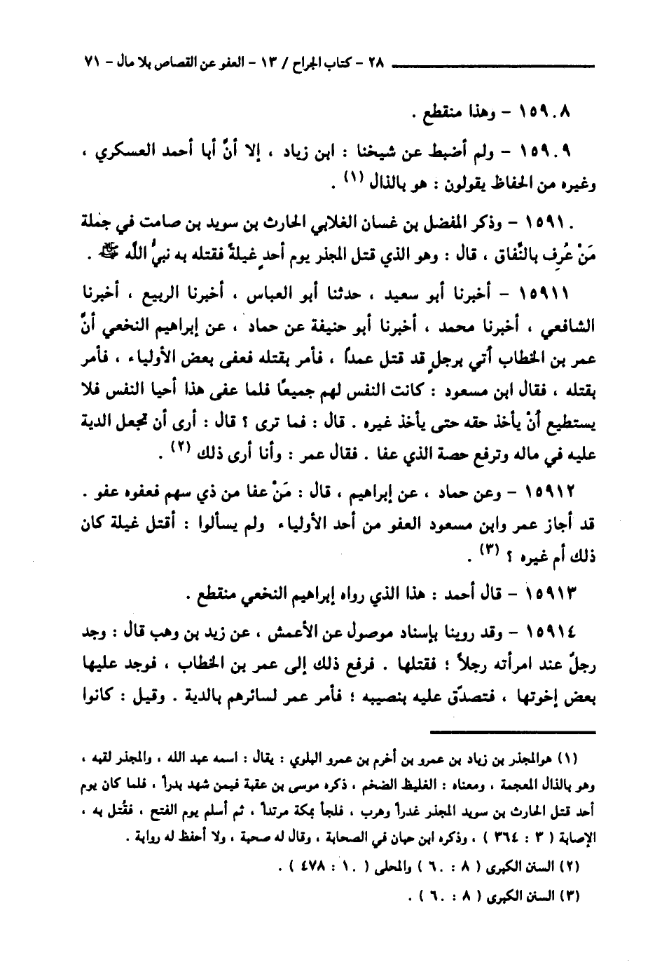 15912 - وَعَنْ حَمَّادٍ , عَنْ إِبْرَاهِيمَ , قَالَ: §مَنْ عَفَا مِنْ ذِي سَهْمٍ , فَعَفْوُهُ عَفْوٌ , قَدْ أَجَازَ عُمَرُ وَابْنُ مَسْعُودٍ الْعَفْوَ مِنْ أَحَدِ الْأَوْلِيَاءِ , وَلَمْ يَسْأَلُوا: أَقُتِلَ غِيلَةً كَانَ ذَلِكَ أَمْ غَيْرُهُ " ,