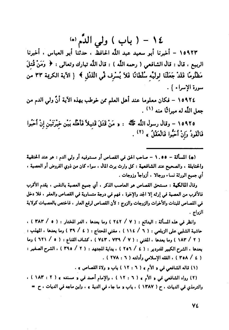 15925 - وَقَالَ رَسُولُ اللَّهِ صَلَّى اللهُ عَلَيْهِ وَسَلَّمَ: «مَنْ قَتَلَ قَتِيلًا فَأَهْلُهُ بَيْنَ خِيَرَتَيْنِ إِنْ أَحَبُّوا فَالْقَوَدُ , وَإِنْ أَحَبُّوا فَالْعَقْلُ» , -[75]-