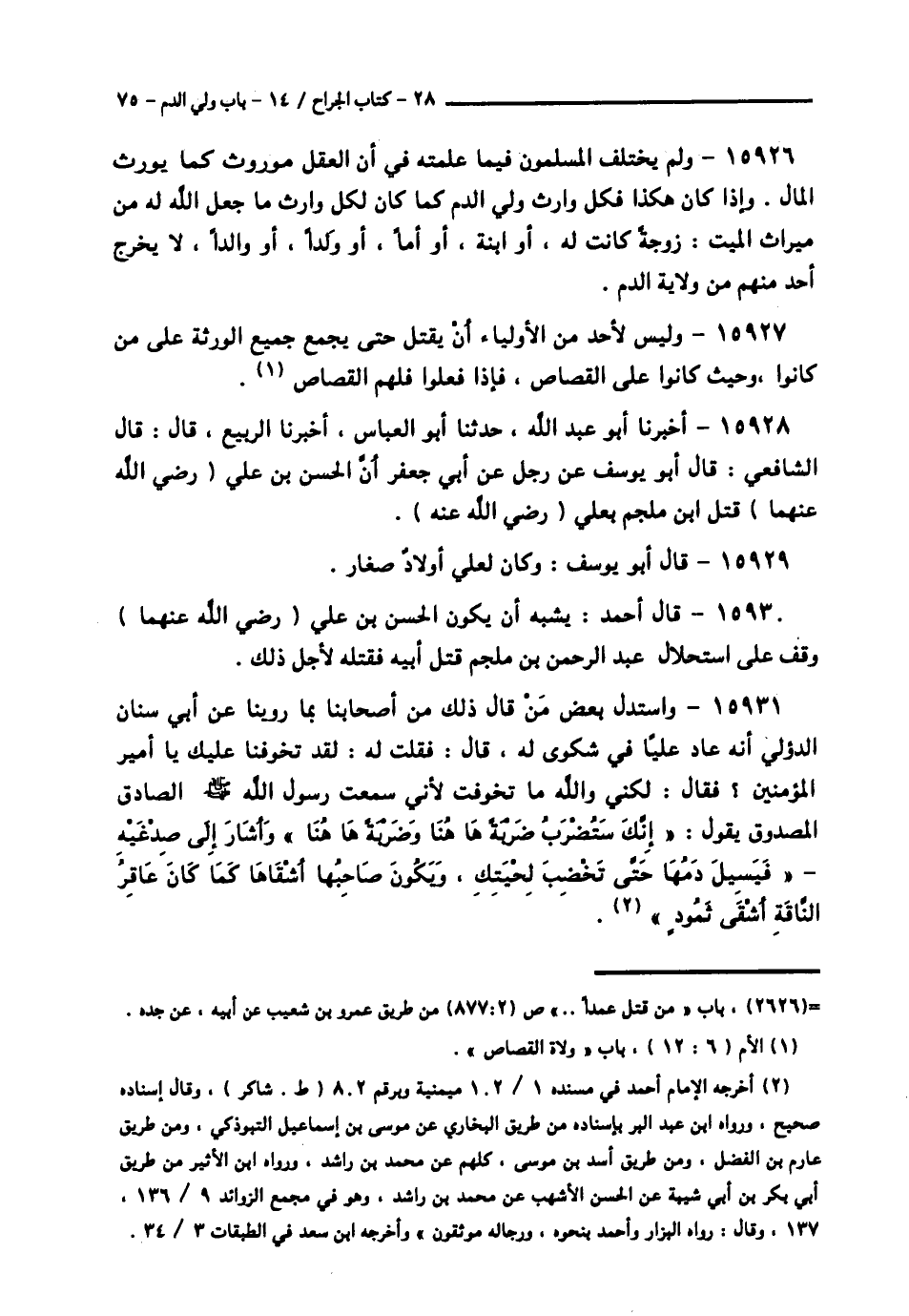 15930 - قَالَ أَحْمَدُ: يُشْبِهُ أَنْ يَكُونَ الْحَسَنُ بْنُ عَلِيٍّ رَضِيَ اللَّهُ عَنْهُمَا وَقَفَ عَلَى اسْتِحْلَالِ عَبْدِ الرَّحْمَنِ بْنِ مُلْجَمٍ قَتْلَ أَبِيهِ فَقَتَلَهُ لِأَجْلِ ذَلِكَ ,